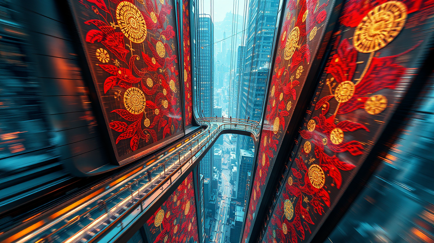 描述:立体社区间的磁悬浮走廊突然泛起金色涟漪,表面如被赋予生命的广绣绸缎,金丝银线编织的凤凰牡丹纹样在透明合金上流动舒展。几位创客踩着发光的醒狮头平衡车穿行而过,车轮碾过之处,粤剧脸谱的投影如涟漪般扩散,走廊内部的脉动光芒为纹样镀上柔光,传统刺绣的针脚与未来科技的数据流在此刻形成奇妙的共振,仿佛岭南女子指尖的丝线穿越时空,织就了一条连接过去与未来的云道。