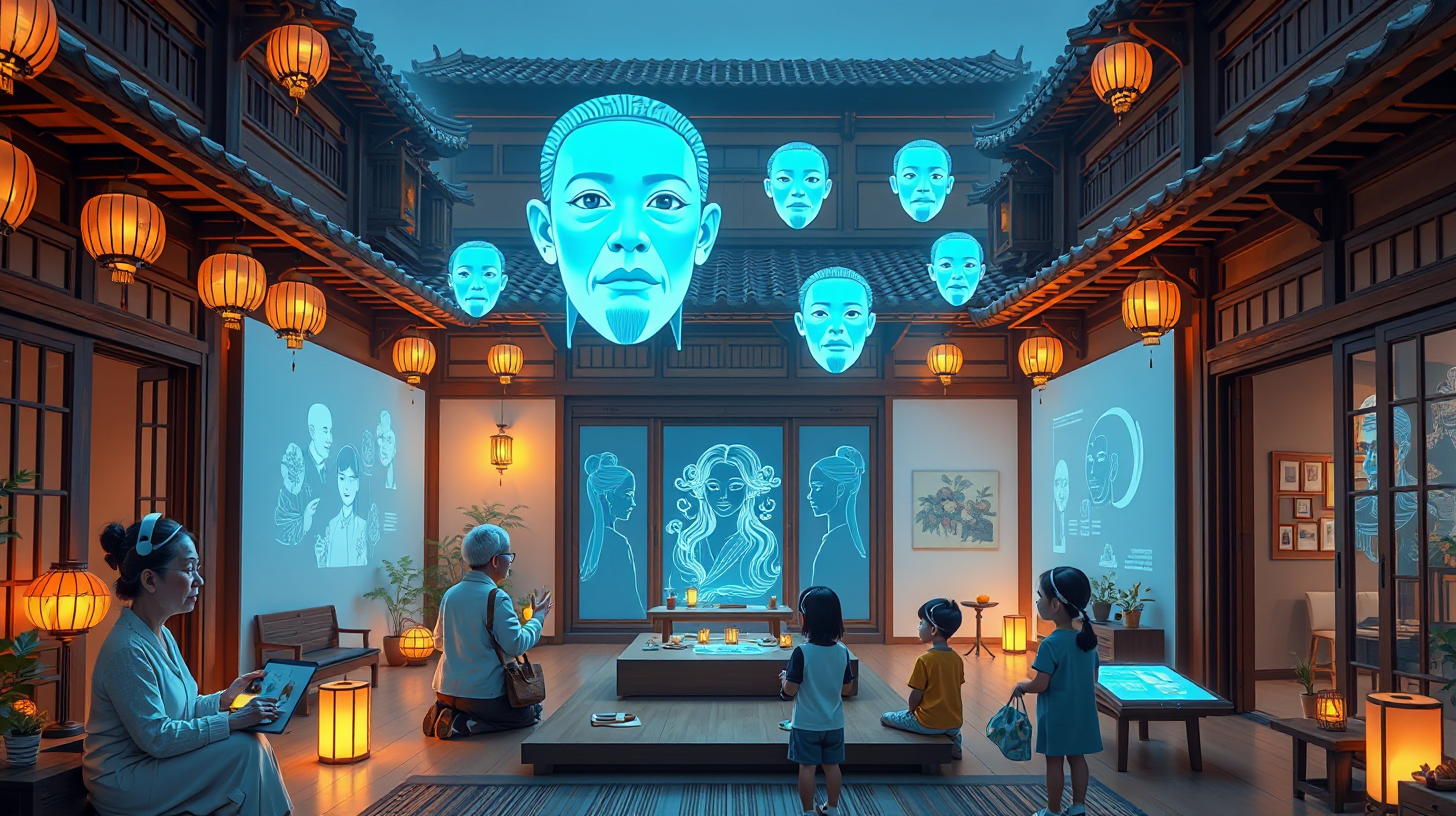 作图提示词:A renovated Beijing siheyuan courtyard house featuring a central modular holographic design studio, elderly residents wearing neural interface headbands to manipulate floating Peking opera mask projections, children interacting with augmented reality history displays, warm ambient lantern lighting blending with cool holographic blue tones, detailed architectural juxtaposition of traditional wooden beams with retractable tech panels, medium close-up shot with balanced three-point lighting to highlight both human activity and technological elements