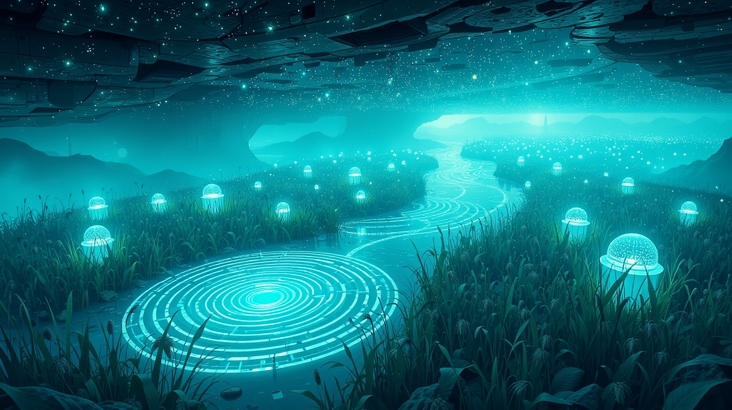作图提示词:A futuristic riverbed scene under Yongding River, with clusters of ecological servers glowing like a galaxy of stars. Holographic water ripple projections flow among reeds, created by citizens storing childhood memories into quantum nodes of the water system. The view is from above, capturing the vast panorama of this serene yet technologically advanced natural setting. The lighting is ethereal, with cool blue and green hues dominating the color palette, creating a mystical and tranquil mood. The environment blends nature with high-tech elements seamlessly, evoking a sense of wonder and nostalgia.