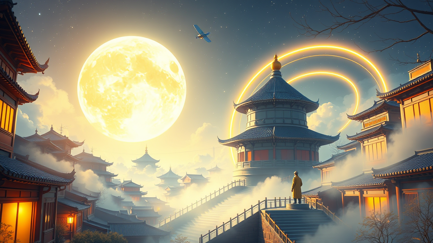 作图提示词:A full moon night in Beijing, where an ancient bell and quantum satellites initiate a ‘city-wide brainwave symphony’. Six hundred years of timekeeping sound waves intertwine with intelligent morning mist in the hutongs, weaving rings of light. The shot is from a side angle, capturing the expansive view of this historical and futuristic scene. The lighting is soft yet vibrant, with golden and silver hues creating a dreamy and harmonious mood. The environment blends traditional architecture with futuristic elements, evoking a sense of timelessness and innovation.