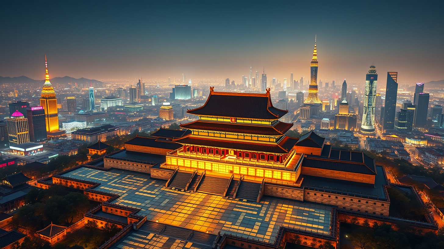 作图提示词:A breathtaking high-altitude drone view of Beijing’s Forbidden City, its golden glazed tiles embedded with synchronized LED arrays mirroring the light patterns of distant CBD smart-glass skyscrapers, forming an illuminated architectural timeline between dynastic and contemporary structures, viewed from Jingshan Park’s augmented reality observatory projecting historical overlays of Yuan, Ming and Qing dynasty layouts, ultra-detailed futuristic cityscape with balanced warm and cool color temperatures, wide-angle composition using rule of thirds to emphasize the historical-futuristic contrast