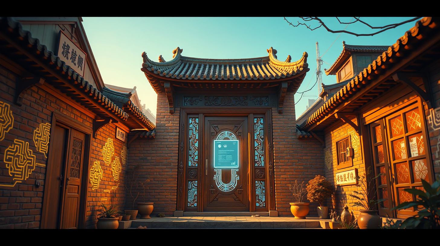 作图提示词:A futuristic Beijing hutong bathed in soft morning light, ancient brick walls embedded with glowing quantum circuitry patterns, an ornate carved wooden door with biometric scanner projecting a breakfast menu hologram, seamless fusion of Chinese architectural heritage with 23rd-century technology, warm golden sunrise color palette, hyper-detailed sci-fi realism with shallow depth of field, low-angle composition emphasizing the high-tech elements against traditional structures