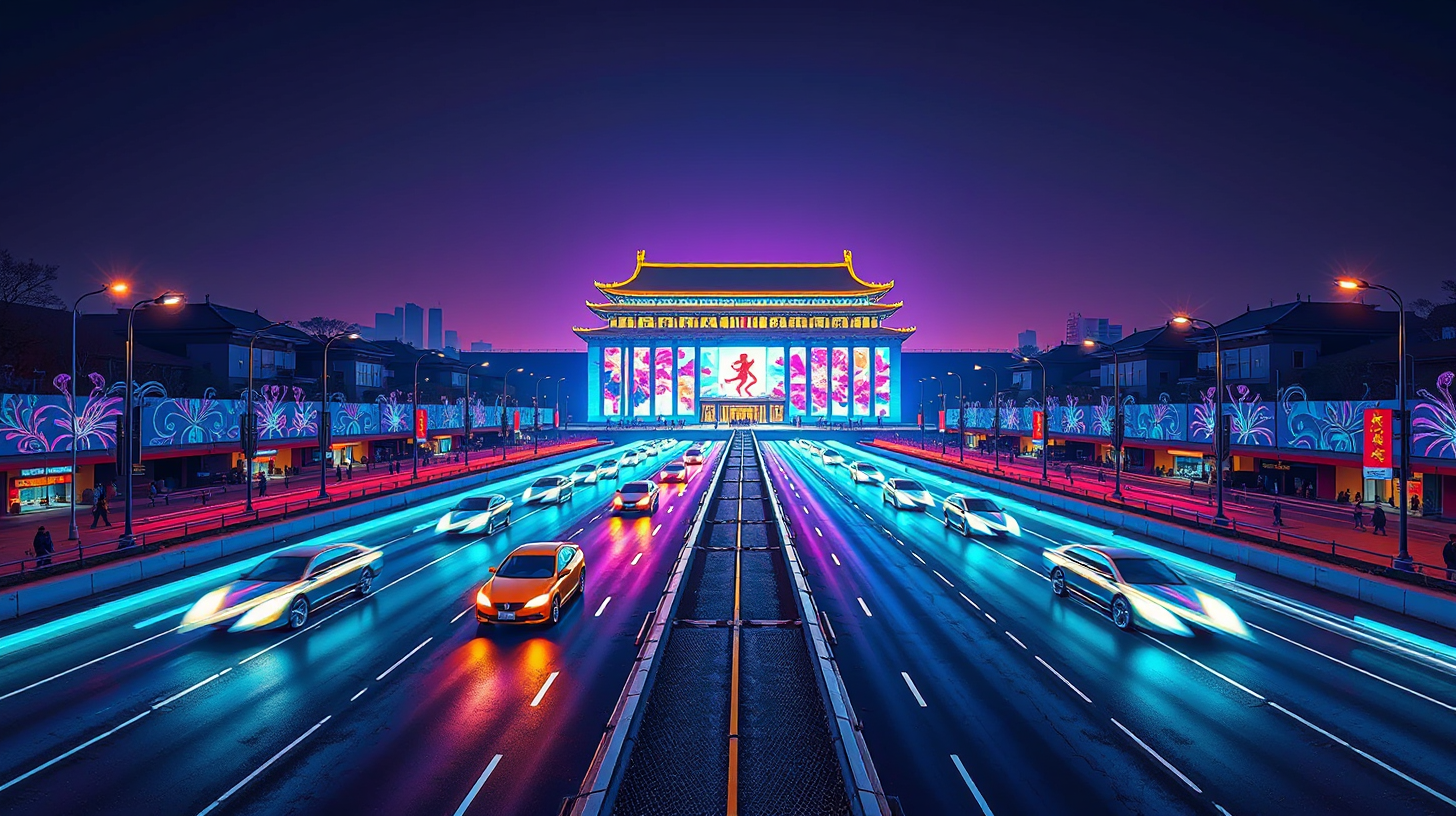 作图提示词:A spectacular nightscape of Beijing’s Chang’an Avenue with adaptive magnetic levitation lanes converting into an illuminated performance platform, synchronized smart vehicles creating temporary light formations that interact with the National Centre for the Performing Arts’ dynamic facade projections, presenting a contemporary digital rendition of classical Chinese dance, vibrant neon color scheme with deep shadows emphasizing the architectural lighting, ultra-wide angle composition using leading lines of the avenue to draw focus toward the performing arts center, long exposure effect capturing light trails