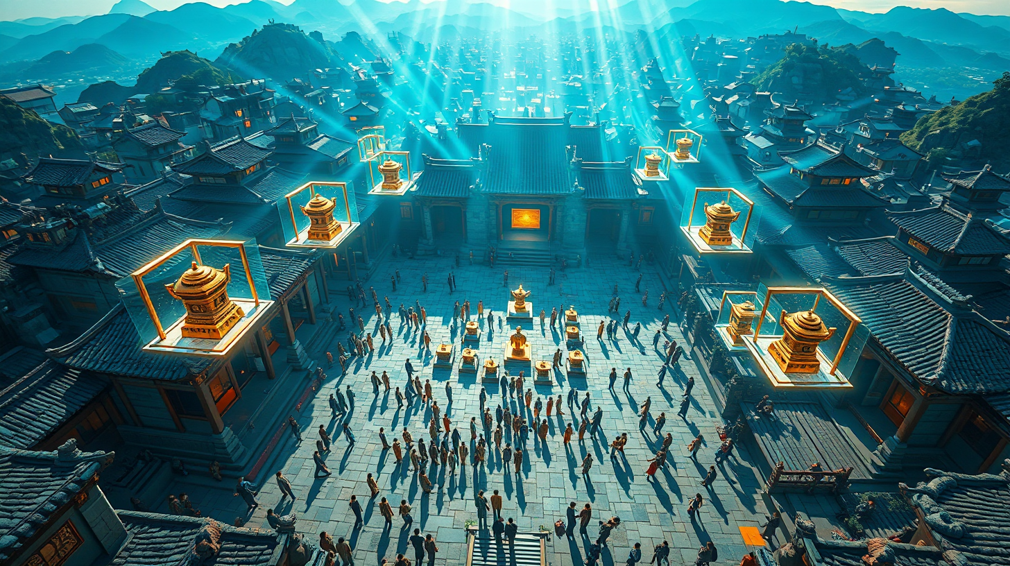 作图提示词:A breathtaking aerial view of a futuristic city square in Guizhou, China, where advanced archaeological robots meticulously reconstruct an ancient Yelang civilization ritual with the aid of quantum field holograms. The holograms display glowing bronze artifacts suspended in mid-air, blending historical reverence with cutting-edge technology. The scene is solemn and historically profound, captured from above to highlight intricate ceremonial details. Dramatic lighting features beams of quantum energy illuminating the square, casting long shadows. The color palette combines vibrant blues and golds against ancient stone architecture, creating a striking contrast between past and future elements. Shot with a high-angle perspective, deep depth of field, and cinematic lighting to emphasize the fusion of eras.