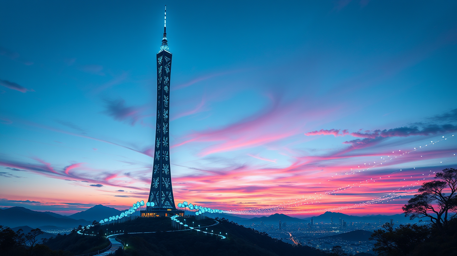 作图提示词:A majestic view of Wumeng Mountain peak, where a towering resonance signal tower stands against the twilight sky. The sleek alloy structure glows with bioluminescent patterns that pulse rhythmically like musical notes. At its base, alloy wind chimes sway in the breeze, activating a city-wide bio-light network that spreads across the landscape like a luminous web. The scene is grand and musically rhythmic, with the tower’s stark silhouette contrasting against the vibrant twilight. Dynamic lighting captures the bio-lights shifting colors in harmony with the wind’s movement, creating a mesmerizing display. Shot with a wide-angle lens to emphasize scale, shallow depth of field to focus on the tower’s details, and a cool-toned color palette to enhance the futuristic ambiance.