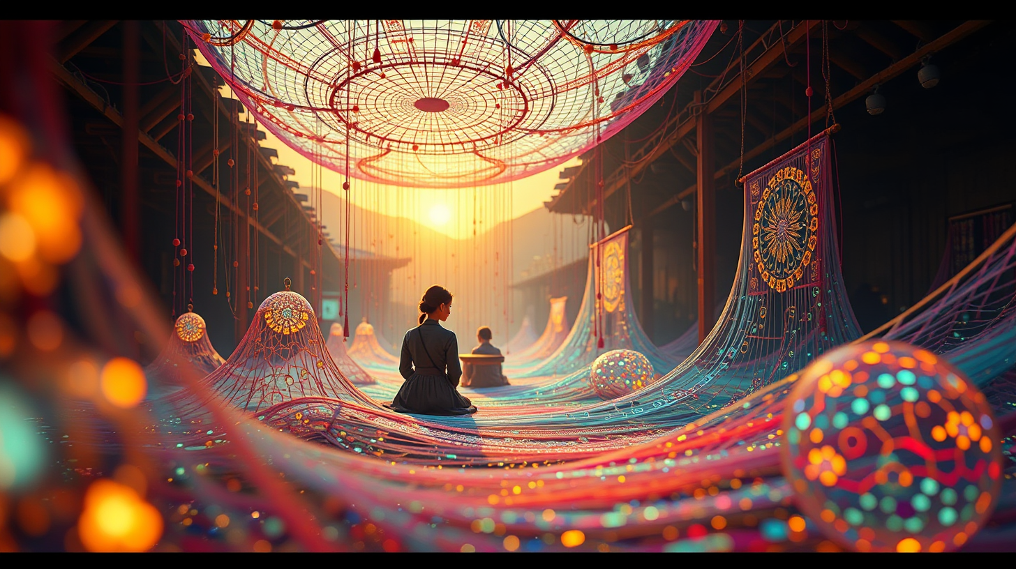 作图提示词:A futuristic quantum textile workshop at dawn, where traditional Miao embroidery techniques merge with advanced nanotechnology. Nanofibers autonomously weave intricate glowing patterns in the air, illuminated by soft morning light. The scene exudes a mysterious and serene atmosphere, captured from an aerial view. Vibrant colors with neon accents create an ethereal mood, framed in an ultrawide shot with balanced composition, shallow depth of field to highlight the glowing patterns, and warm golden-hour lighting enhancing the textile details.