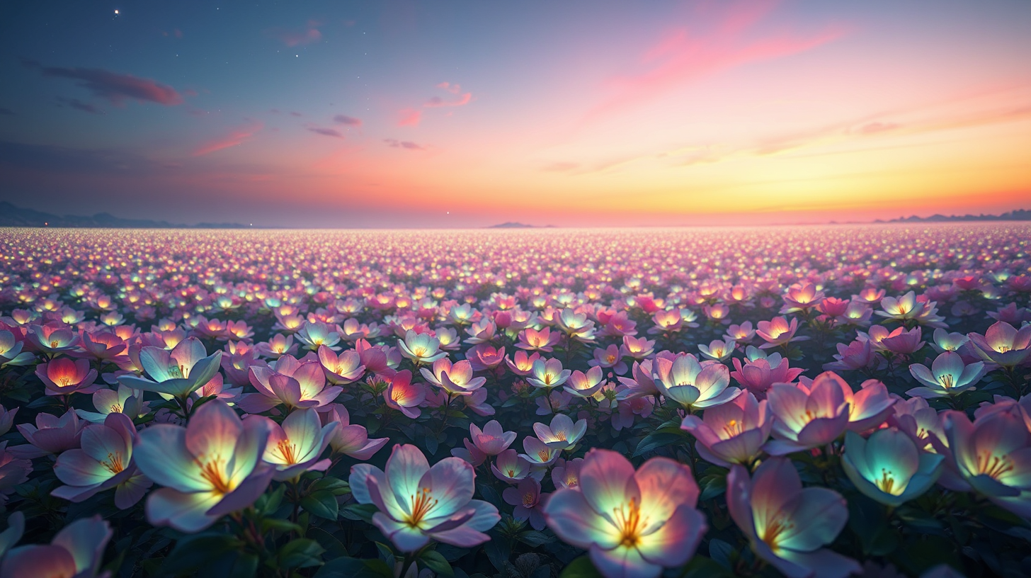 作图提示词:A vast bioluminescent azalea garden stretching to the horizon, where petals embedded with micro-photonic elements flicker in response to environmental changes. Captured in a horizontal composition to emphasize the endless floral expanse, the scene radiates a romantic and emotionally charged atmosphere. The flowing colors transition through the spectrum, creating a dreamy mood. Shot as a panoramic with rule-of-thirds composition, macro details of glowing petals in the foreground, and twilight lighting to enhance the bioluminescence.