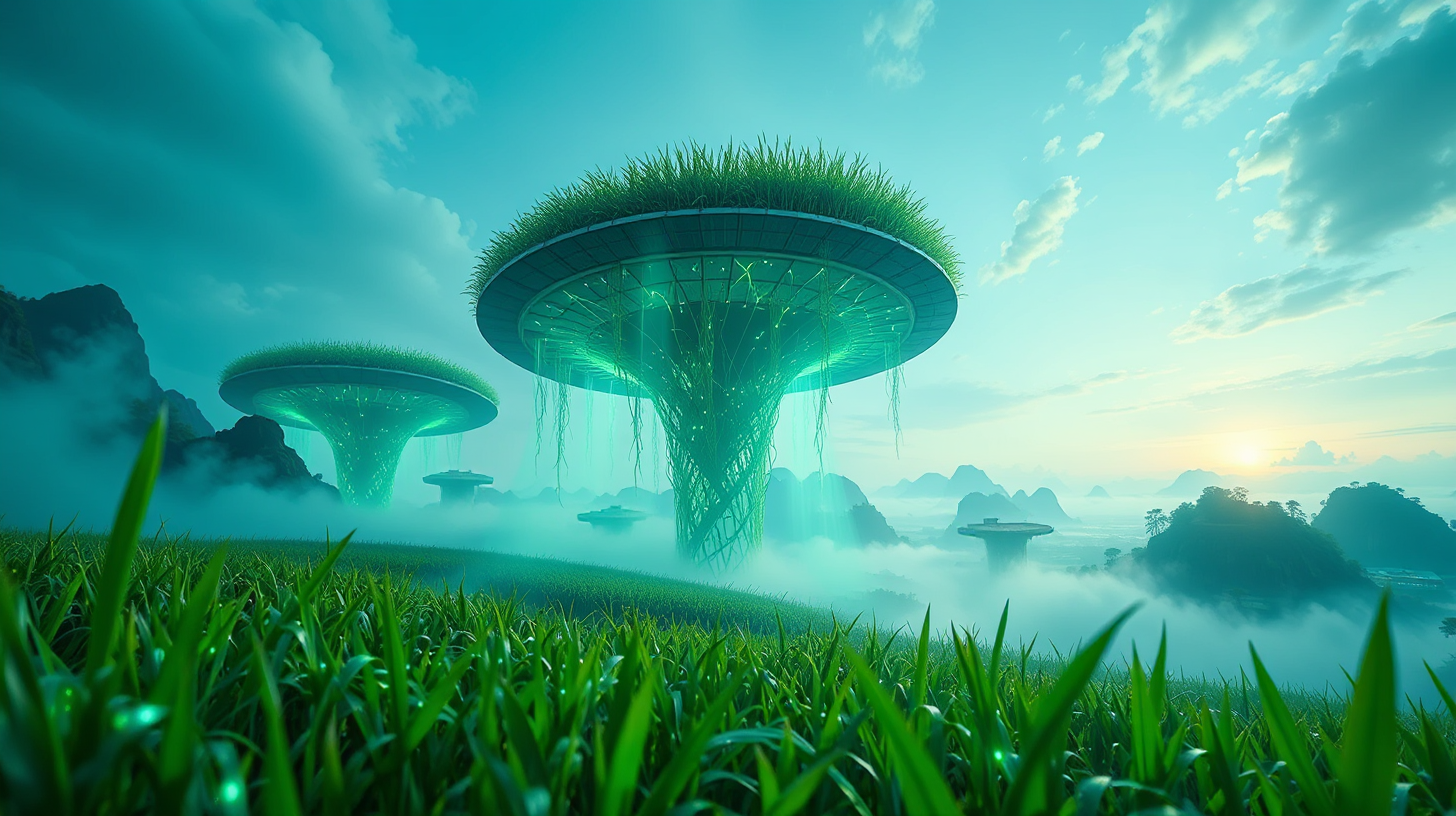 作图提示词:Spiral-shaped anti-gravity ecological farms floating above a transformed karst landscape, featuring rice roots enhanced with bioluminescent neural networks. Real-time growth data is projected into the morning mist, viewed from a dramatic low angle. The scene harmonizes technology and nature, using vibrant green and blue tones with a dynamic energetic mood. Shot with an ultrawide lens to emphasize scale, deep focus to capture both foreground roots and distant farms, and diffused lighting to soften the bioluminescent glow.
