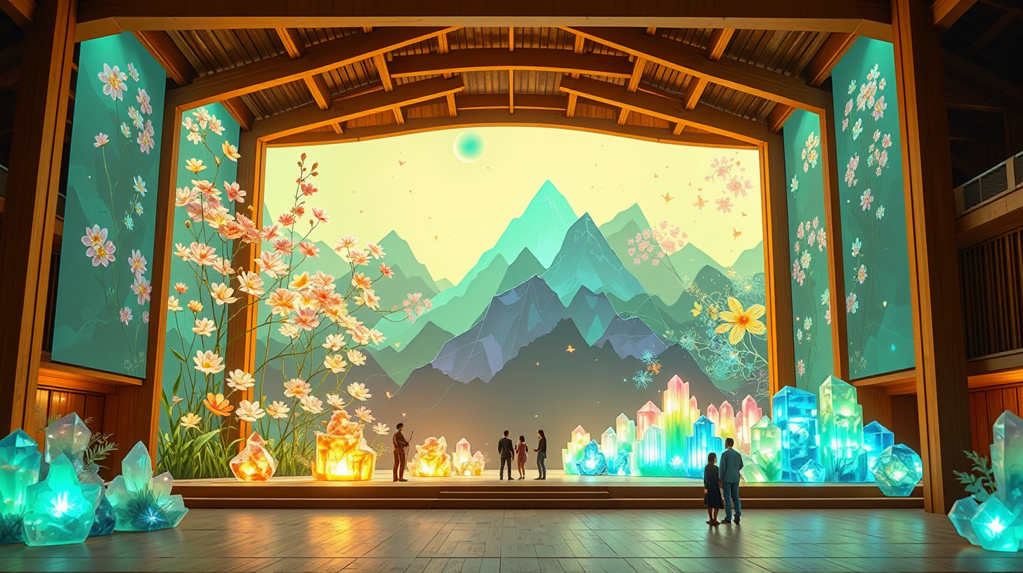 作图提示词:The reconstructed Liu Sanjie singing stage now functions as a memory bank. Its facade comes alive with holographic ethnic costumes that bloom like flowers when duet sound waves reach specific frequencies. Inside, emotion algorithms adjust the ‘mountain song core’ while citizens deposit memories into a database structured like colorful glutinous rice molecules. Futuristic ethnic fusion architecture with traditional wooden beams and high-tech elements, translucent data storage crystals in rainbow hues, dynamic projection mapping with synchronized light patterns, warm cultural technology integration. Shot with a tilt-shift lens to emphasize both architectural details and holographic displays, soft diffused lighting to create a welcoming atmosphere, color scheme combining warm wood tones with vibrant digital projections.
