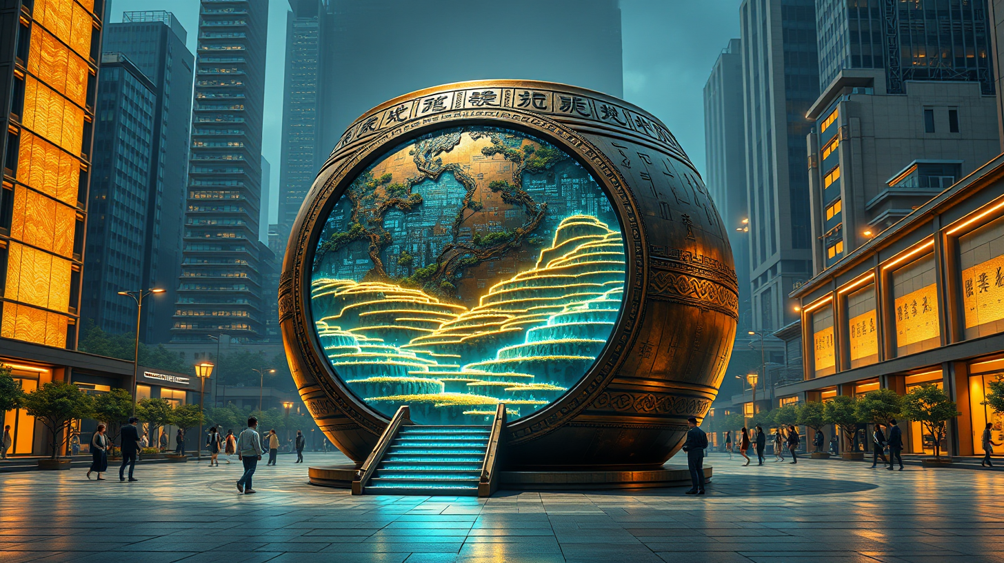 作图提示词:An ancient bronze drum transformed into a dimensional portal dominates an urban plaza. Its surface pulses with nano-scale Zhuang script codes that convert dancers’ bioelectricity into energy streams. The projection forms cascading holographic terraces of data flow, resembling traditional rice terraces but made of luminous information particles. Futuristic yet rooted in tradition, ultra-detailed metallic textures with patina details, glowing circuitry patterns in cyan and gold, dynamic lighting effects with rim lighting to emphasize the portal’s energy, mysterious technological artifact. Composition using rule of thirds with the drum as focal point, medium shot to show both the artifact and its holographic projections, high contrast between warm metallic tones and cool holographic blues.