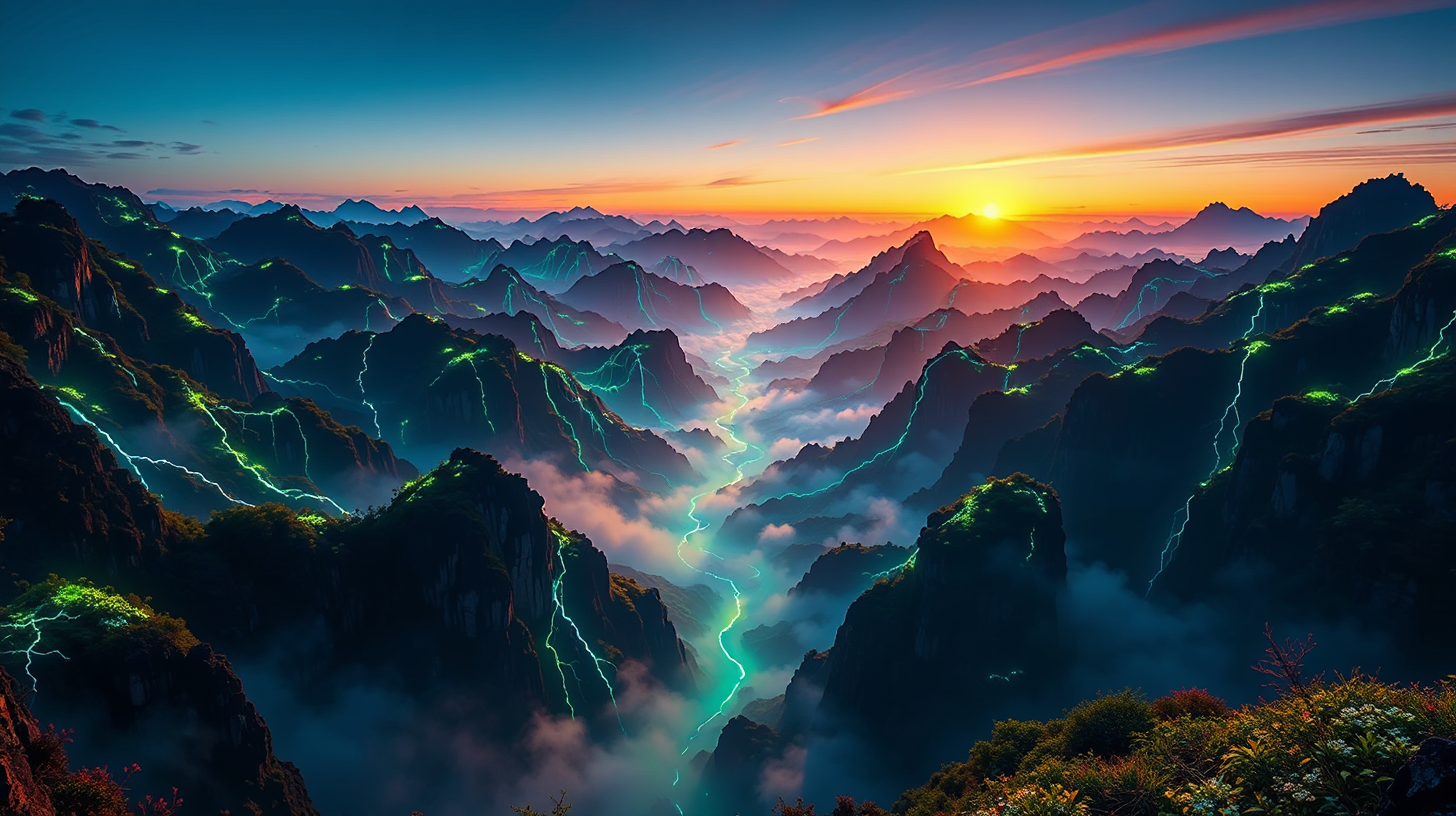描述:黎明的微光刺破河池喀斯特峰丛的晨雾,墨绿色的山体表面突然浮现出翡翠色的生物荧光脉络,如大地的毛细血管般脉动。随着朝阳攀升,这些由天然量子苔藓构成的神经网络渐次变幻,从琥珀金流淌成琉璃紫,最终在峰巅聚成一道连接天地的动态光谱柱。当第一缕阳光完全洒落,整片山脉如琴弦般共鸣,壮锦纹样的全息投影在雾霭中流转,古老的几何图案与量子光效交织,似在诉说自然与科技的秘语。