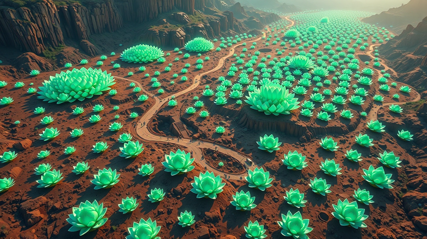描述:矿区遗址上空,数百个清洁机器人如白头叶猴群般灵巧翻飞,背部的太阳能板展开成绽放的金属莲花。它们编织的量子薄膜如绿色轻纱覆盖废矿坑,重金属粒子在薄膜中化作微光,缓缓沉降为喀斯特溶洞中新生的钟乳石原料。午后的阳光穿过薄膜,在地面投下细碎的光斑,机械蜂鸣与矿石转化的滋滋声和谐共鸣,科技以谦卑的姿态融入自然,让伤痕累累的大地重焕生机。