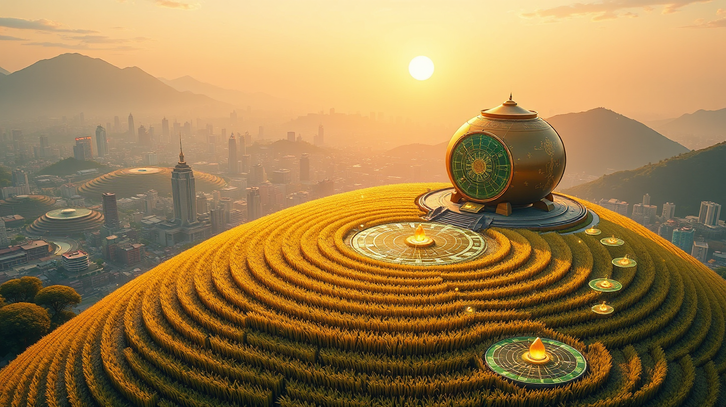 描述:城市中心的巨型铜鼓建筑如花朵般展开,反重力梯田载着发光稻种缓缓旋转。都安星象图在稻穗间流淌,每粒光子都封印着二十四节气歌谣,壮族银饰纹样在稻芒上闪烁,AI计算的云纹与壮锦经纬交织成光网。夕阳西下时,成熟的谷粒爆裂,农业数据库如星群射向群山,宛如古代铜鼓的声波唤醒沉睡的梯田,让传统农耕智慧在量子时代的星空中重新播种。