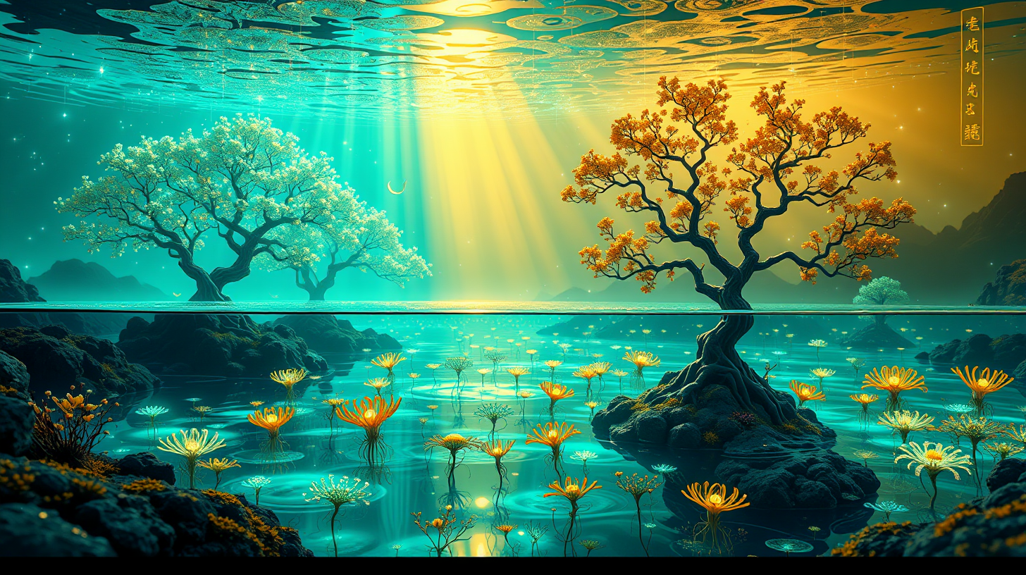 作图提示词:Underwater view of a futuristic thermal spring in Guangxi, glowing with bioluminescent organisms, holographic ancestral trees projected through crystal-clear mineral water, traditional Yao medicine herbs suspended like constellations, warm golden light filtering from surface, ethereal atmosphere of intergenerational wisdom transmission, ultra HD details of swirling bioluminescent particles forming intricate genealogy patterns, cinematic lighting with volumetric rays, vibrant turquoise and amber color palette, magical realism style.
