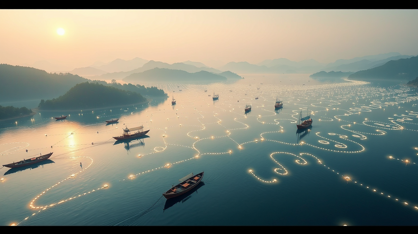 描述:晨光如金纱般洒在巢湖水面,由量子浮标组成的动态光网在碧波上缓缓流转,每一个浮标都像一颗坠入人间的星辰,闪烁着幽蓝的科技微光。渔民们驾驶着配备生物能转换器的智能渔船穿梭其间,船尾拖曳出的数据流化作璀璨光轨,与水面光网交织成一曲科技与自然和谐共鸣的视觉乐章。