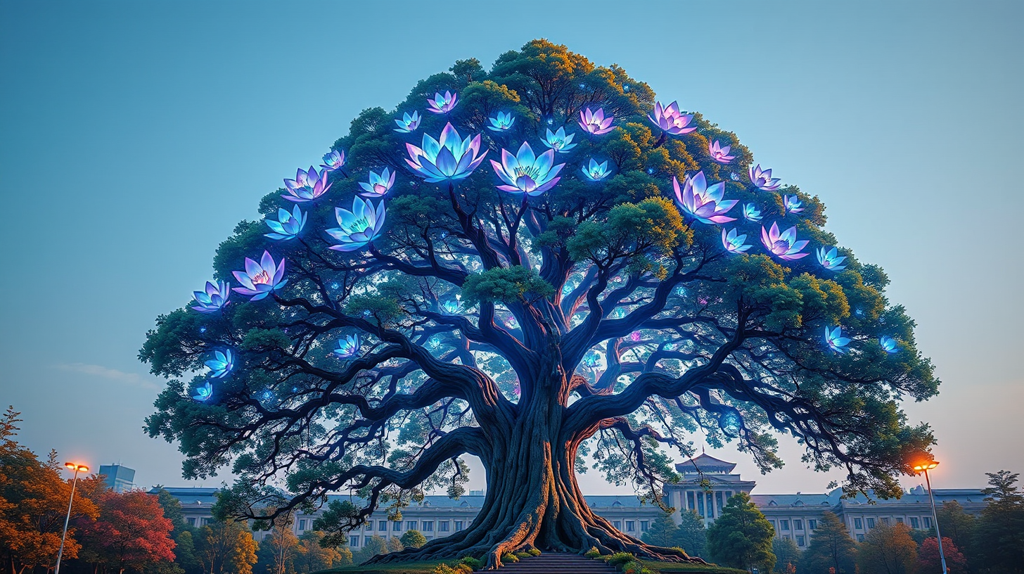 描述:中国科大校园里,那棵饱经沧桑的百年古树正焕发着不可思议的生机,枝桠间绽放出无数全息花朵。每一片半透明的花瓣都投影着学生们天马行空的创新点子,数学公式、物理模型、艺术构想如流光般在花瓣上舞动,汇聚成一座不断生长的知识光谱塔,将古朴的树冠笼罩在智慧的七彩光晕之中。
