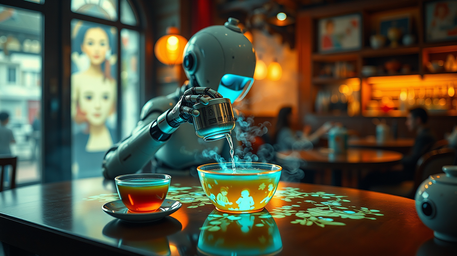 作图提示词:Inside a retro teahouse on Lei Street, a robotic arm tea master prepares tea using plasma technology. The surface of the tea displays holographic projections of customers’ childhood memories, creating a warm and nostalgic atmosphere. Captured with a macro lens for detail shots of the tea surface, using a combination of practical lighting and CGI-enhanced holograms. The color temperature shifts from the cool blue of the plasma to warm amber tones of the memories. Composition uses shallow depth of field to focus attention on either the robotic precision or the emotional memory projections.