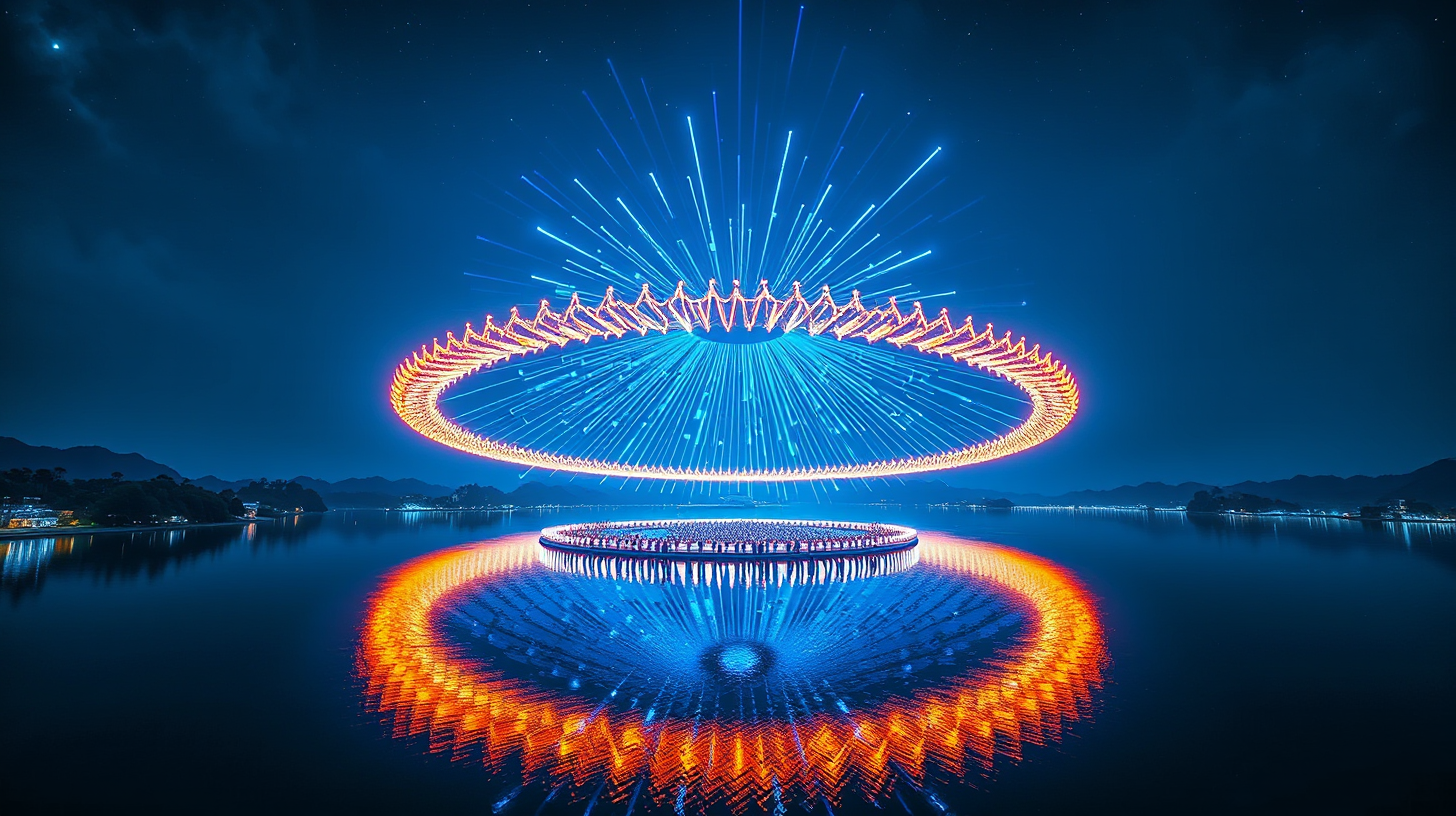 作图提示词:Night view over Chao Lake, countless smart wristbands glowing in synchronized patterns, forming a gigantic luminous starburst ring above the water. The reflections create a double ring effect on the lake surface, with a deep blue night sky contrasted by vibrant electric blue and white lights. The scene is captured in an ultra-wide aerial shot, highlighting the perfect symmetry of the quantum light display and the fusion of technology and nature.