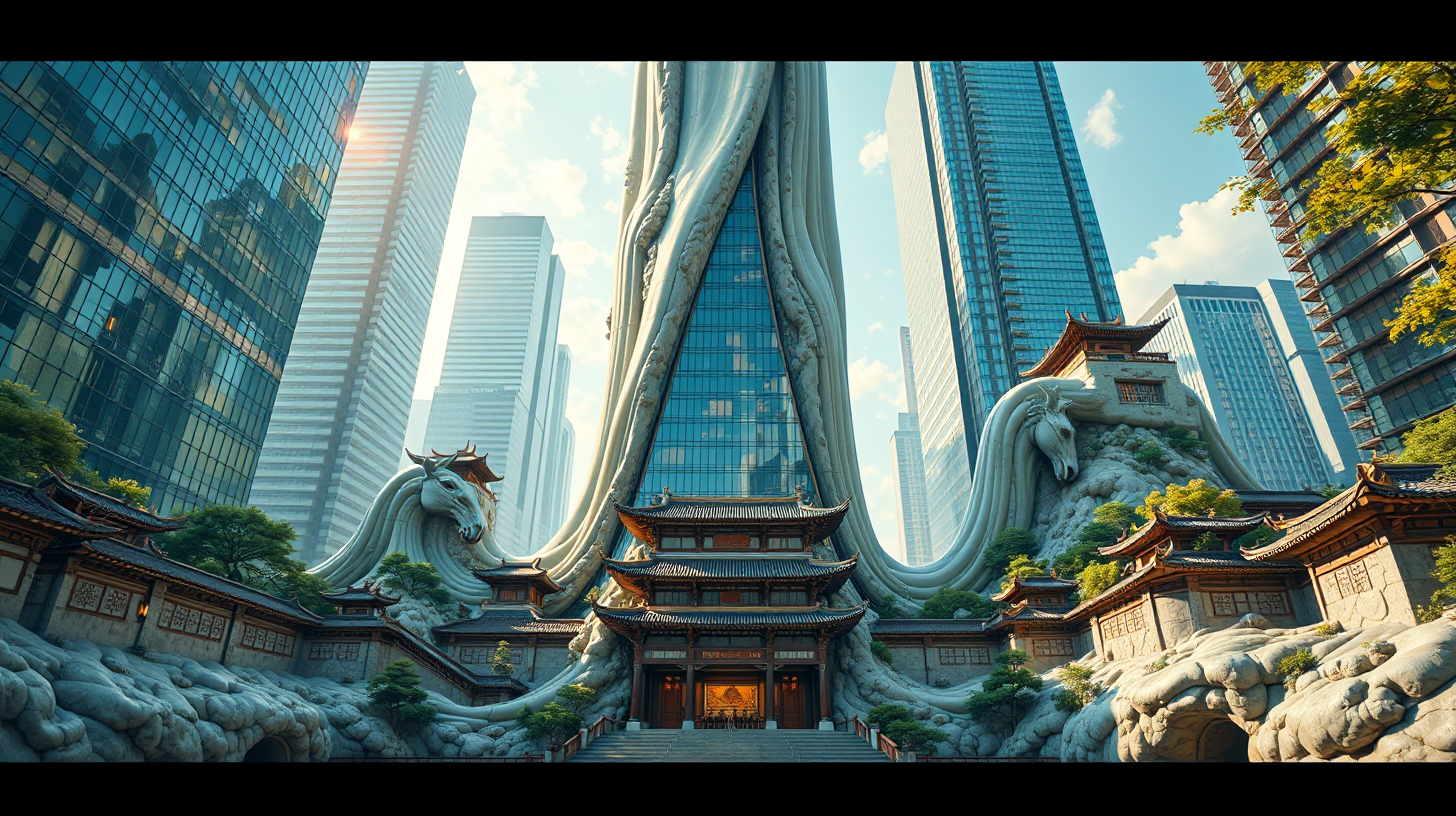 作图提示词:A stunning transformation scene in Swan Lake Business District, where modern skyscrapers morph into traditional Hui-style architecture during lunch break. The glass facades flow like liquid, reshaping into horse-head walls with intricate details. Shot with a tilt-shift lens to maintain sharpness throughout the vertical transformation, using high dynamic range to capture both the modern and traditional elements. The lighting transitions from cool corporate tones to warm traditional hues during the transformation. The composition uses vertical framing to emphasize the height of the buildings and the dramatic change.