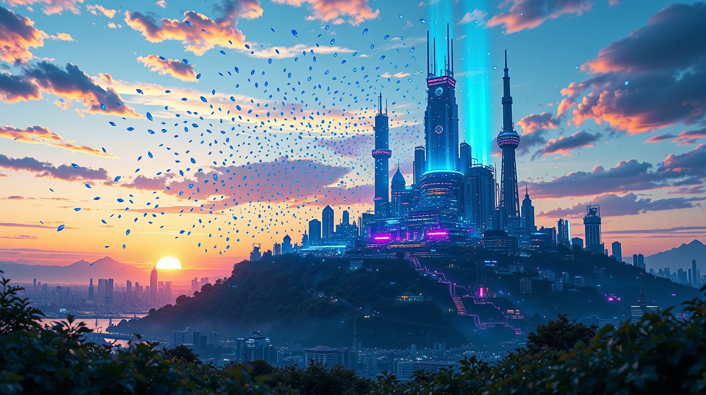 作图提示词:A futuristic scientific island at dusk, glowing seeds of knowledge floating from a fusion reactor, illuminating the twilight sky with vibrant neon blue and purple hues against a golden sunset. The scene features an ethereal atmosphere with dynamic lighting, captured in an ultra-wide shot from a low angle to emphasize the majestic dispersal of luminous seeds across the city skyline, blending advanced technology with natural beauty.