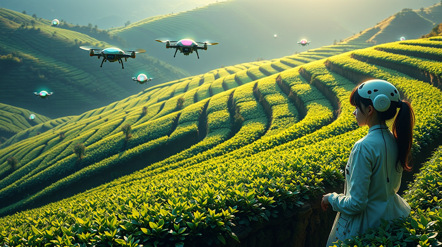 作图提示词:anime surrealistic fantasy, A medium side-shot of Longjing tea terraces featuring farmers wearing discreet neural interfaces, with tea leaves emitting subtle bioluminescence that shifts hue according to emotional data. Mechanical tea-picking drones with organic-inspired designs hover between rows, transporting leaves to floating processing spheres. The composition uses rule-of-thirds framing with the terraces leading the eye, shot under warm daylight with balanced exposure to showcase both the vibrant green foliage and the colorful glow effects. The lighting creates soft shadows that emphasize the terraces’ contours while maintaining detail in both foreground and background.