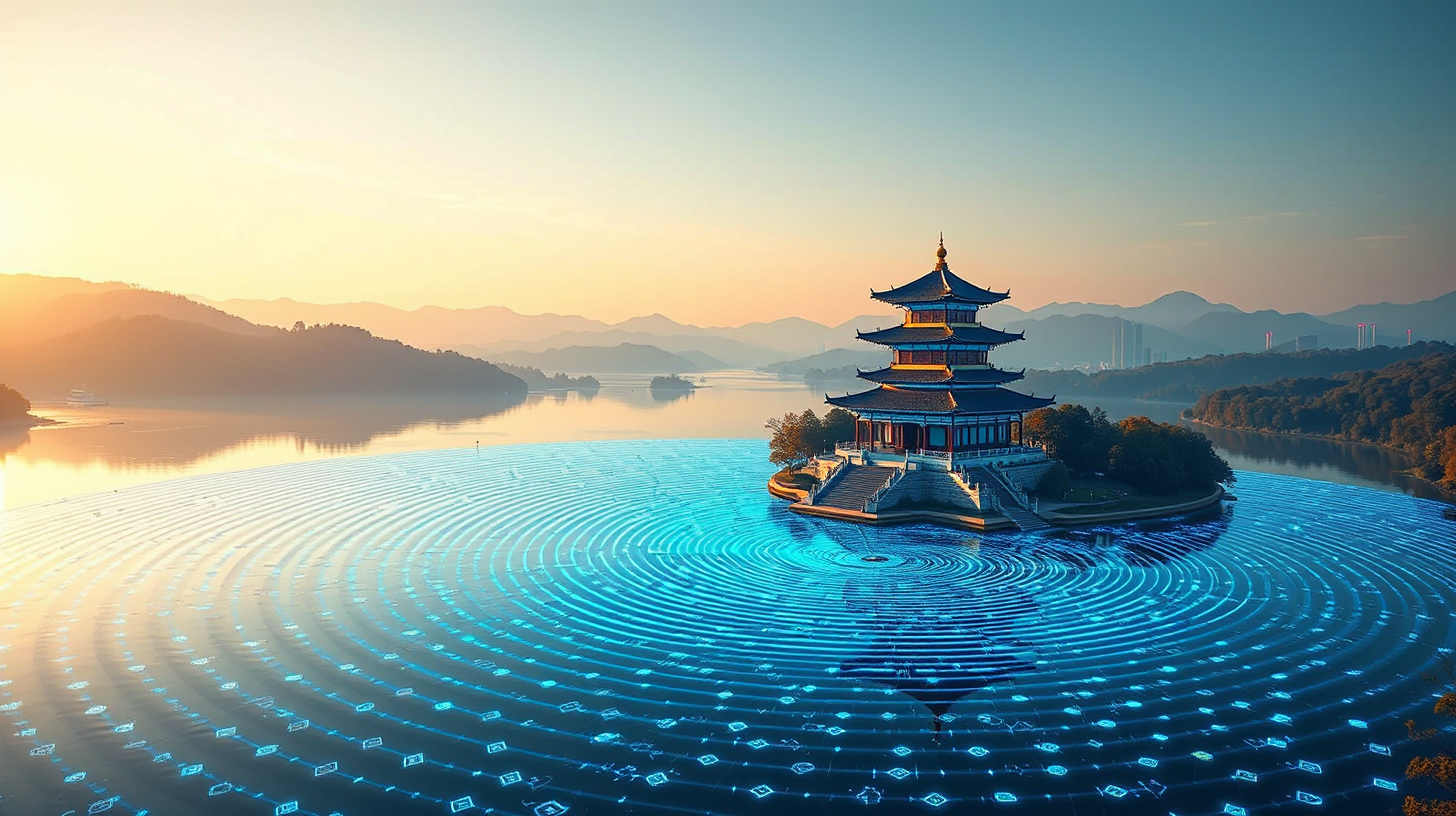 作图提示词:anime surrealistic fantasy, A breathtaking aerial view of West Lake at dawn in modern Hangzhou, with dynamic quantum ripples glowing on the water surface, each ripple transforming into bioluminescent particles forming energy patterns that harmonize with Baochu Pagoda. The composition uses a wide-angle lens to capture the vastness of the scene, with soft morning light casting golden hues across the lake, while cool blue quantum energies create ethereal contrast. The color palette blends traditional Chinese landscape tones with futuristic neon accents, using shallow depth-of-field to emphasize the quantum effects while maintaining the pagoda’s sharp detail.