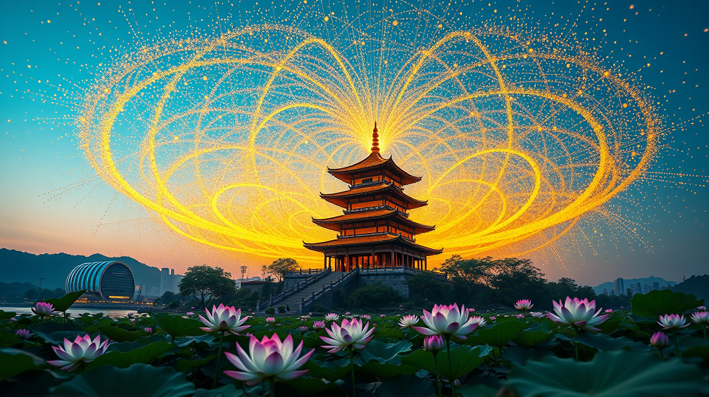 作图提示词:anime surrealistic fantasy, A wide-angle dusk composition of Leifeng Pagoda in 2045 Hangzhou, where its newly installed emotional spectrum system emits fractal golden particles derived from the city’s real-time happiness metrics. These nanotech particles weave through the West Lake ecological light network, forming a shimmering therapeutic dome over the city. Shot from a low 24mm perspective with deep focus (f/16), the frame contrasts the pagoda’s ancient silhouette against the particle storm, using backlighting to make each strand glow. The color grading blends twilight indigos with the particles’ warm 2200K emission, while long exposure (8s) creates light trails showing the dome’s growth pattern. The foreground includes AI-cultivated lotus flowers whose petals mirror the particles’ intensity through biofluorescence.