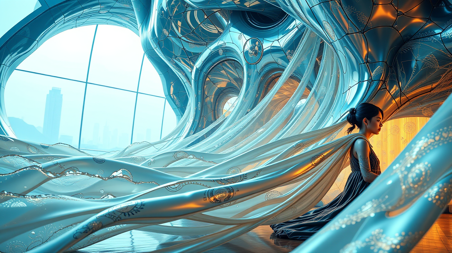 作图提示词:anime surrealistic fantasy, A dynamic side view of designers in a morphable topological building in Hangzhou, using neural interfaces to control liquid metal looms that weave silk fabrics with patterns mirroring real-time Qiantang River tidal data. The composition employs a medium-wide shot to capture both the designers’ focused expressions and the flowing metallic fabrics. The lighting combines cool ambient tones with dynamic reflections off the shifting architectural surfaces, using a slightly faster shutter speed to freeze the motion of the liquid metal while allowing fabric movement blur. The color scheme balances warm human elements with sleek technological surfaces.