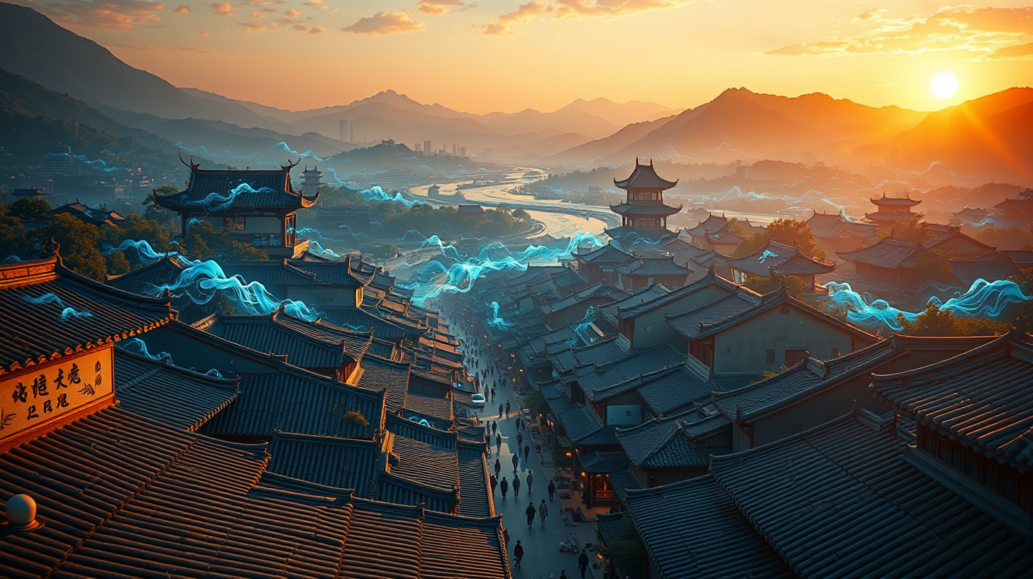 作图提示词:anime surrealistic fantasy, A high-angle cinematic shot of Southern Song Imperial Street in 2045 Hangzhou, where ancient Chinese architecture walls pulse with dynamic quantum fusion projections of ‘A Thousand Li of Rivers and Mountains’ and ‘Along the River During the Qingming Festival’. The holographic ink-wash animations flow like liquid light in perfect sync with citizens’ neural activity, creating an ever-shifting tapestry of cultural memory. Shot with a 28mm tilt-shift lens at golden hour, the composition balances the grandeur of Ming-era rooftops with neon data streams that bleed into traditional xuan paper textures. The color palette merges Song dynasty mineral pigments with bioluminescent cyan/amber hues, rendered in 12K HDR with motion blur capturing the real-time projection shifts.