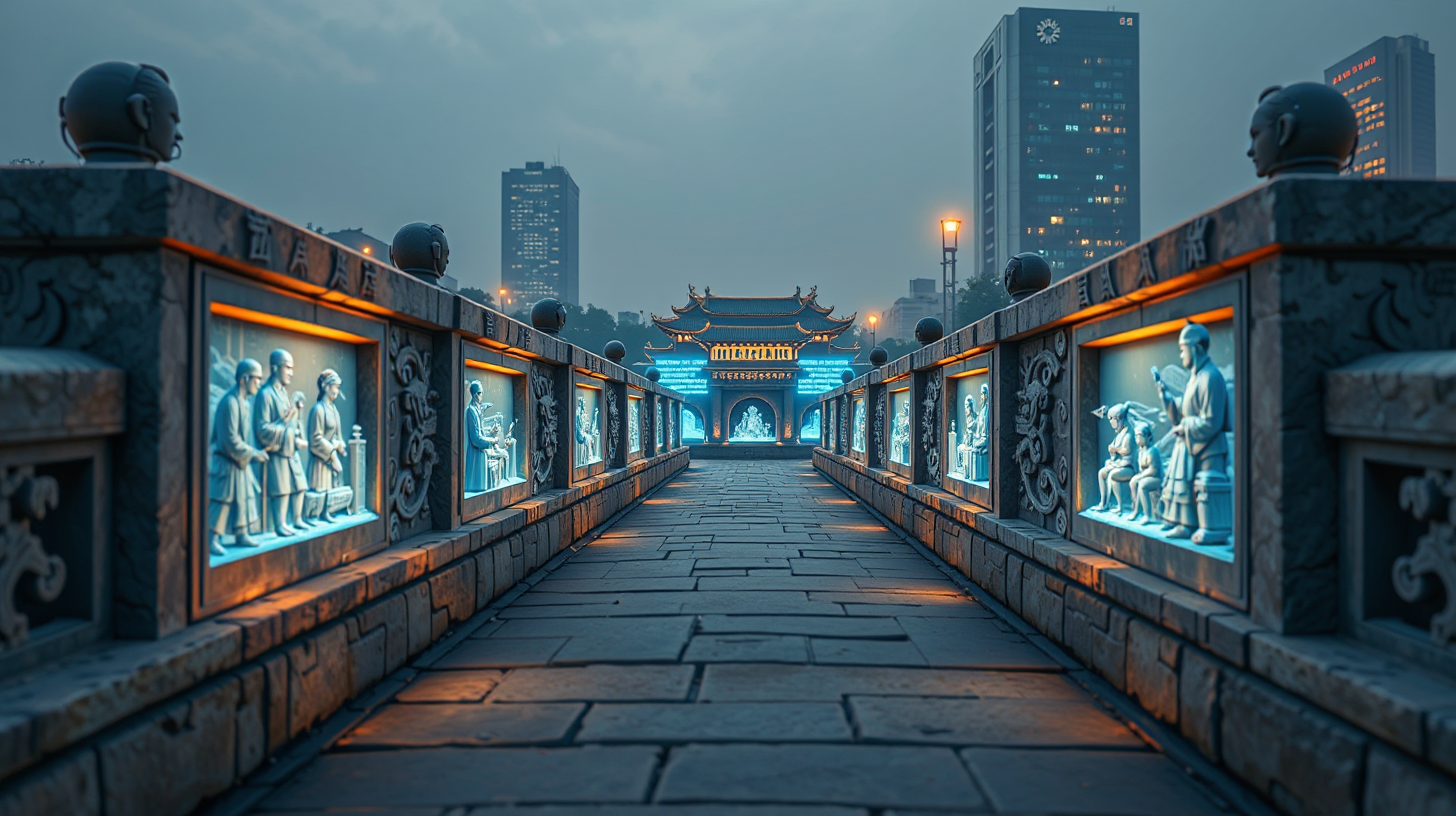 作图提示词:anime surrealistic fantasy, A detailed close-up front view of Gongchen Bridge’s ancient stone railings in modern Hangzhou, with semi-transparent holographic projections displaying dynamic historical narratives of the Grand Canal. Nano-robots activate miniature 3D dioramas when interacting with bridge carvings. The composition uses a medium telephoto lens to compress perspective, with warm tungsten-like lighting on the stonework contrasting against cool blue holograms. The depth-of-field is carefully balanced to keep both the physical reliefs and holograms in focus, while the color grading maintains historical authenticity in the stone against the futuristic projections.