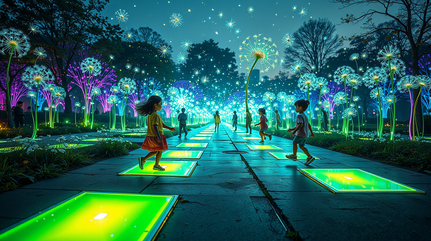 作图提示词:A futuristic city park in Ganzhou, China, featuring rare-earth composite panels embedded in the ground that emit rhythmic therapeutic light waves synchronized with footsteps. Children playfully chase glowing ‘light dandelions’ floating in the air, their tiny particles designed to absorb negative energy. Captured from a low angle, the scene highlights the dynamic flow of light and the joyful atmosphere, with vibrant colors and neon accents enhancing the energetic mood. An ultrawide shot emphasizes the striking contrast between the high-tech elements and the natural park setting, showcasing a harmonious blend of technology and nature.