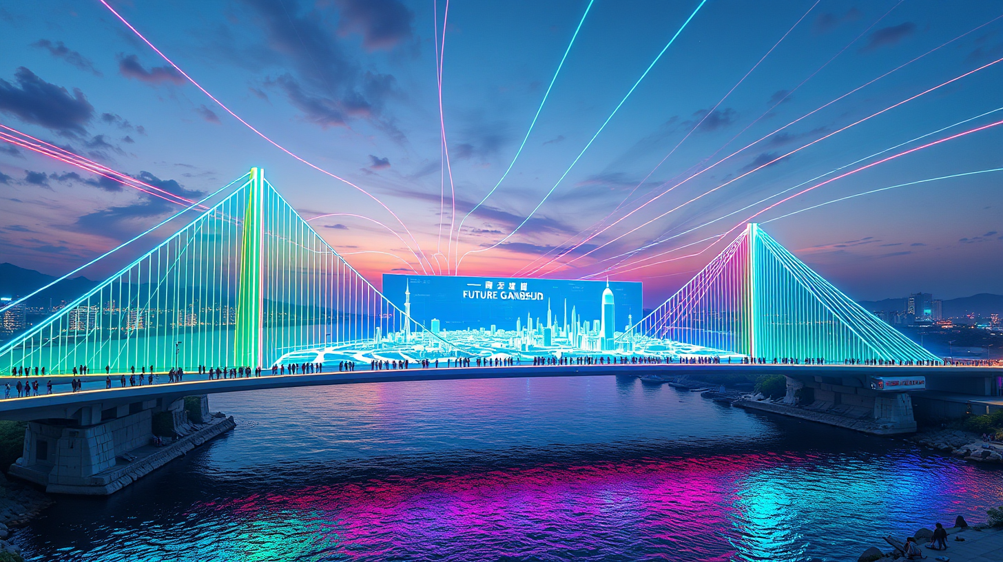 作图提示词:A neural interface bridge spans the Gan River in futuristic Ganzhou, China, where colored light ribbons rise from both banks as pedestrians interact with sensors on the railings. These luminous strands converge at the river’s center to form a holographic blueprint titled ‘Future Ganzhou’. The scene is captured from an aerial view, highlighting the grand scale of the ceremony. Vibrant light trails streak across the dusk sky, enhanced by cinematic lighting with a neon glow, creating an awe-inspiring mood. An ultra-wide shot captures the entire river panorama, emphasizing the bridge’s architectural marvel and the collective energy of the event.