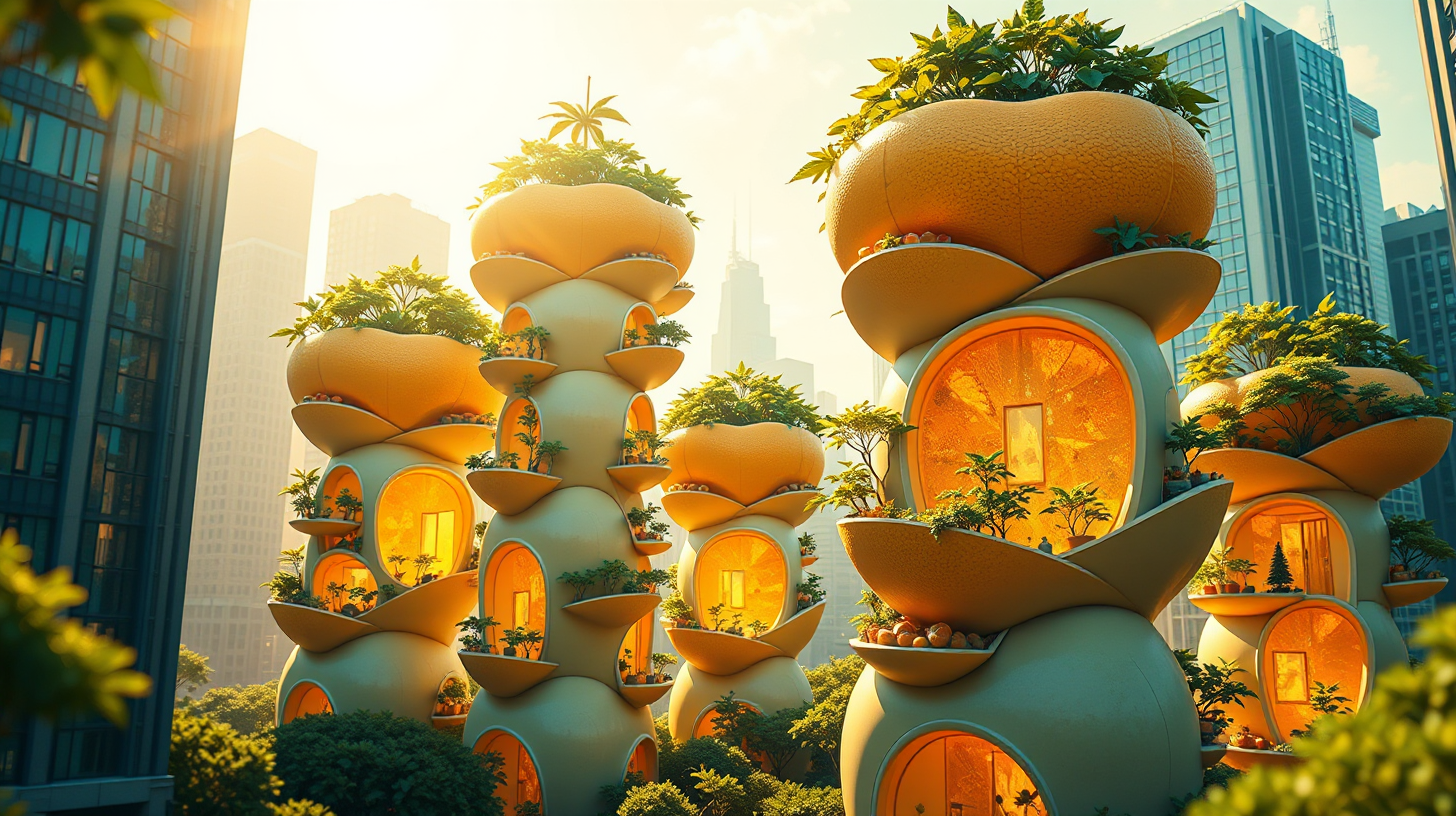 作图提示词:A cluster of futuristic eco-towers shaped like segmented oranges, with petal-like balconies covered in genetically optimized citrus trees. At the top of the towers, aroma particle generators release sweet citrus scents into the wind. The towers glow softly in the sunlight, their organic forms contrasting with the sleek urban surroundings. The scene is vibrant and lively, with the scent almost visible in the air. Photographic style: Mid-range shot with a shallow depth of field to focus on the organic details of the towers while softly blurring the urban background. Warm sunlight highlights the citrus trees and balconies, with a slight haze effect to suggest the scent diffusion. Vibrant color grading to emphasize the citrus hues and glowing effects.
