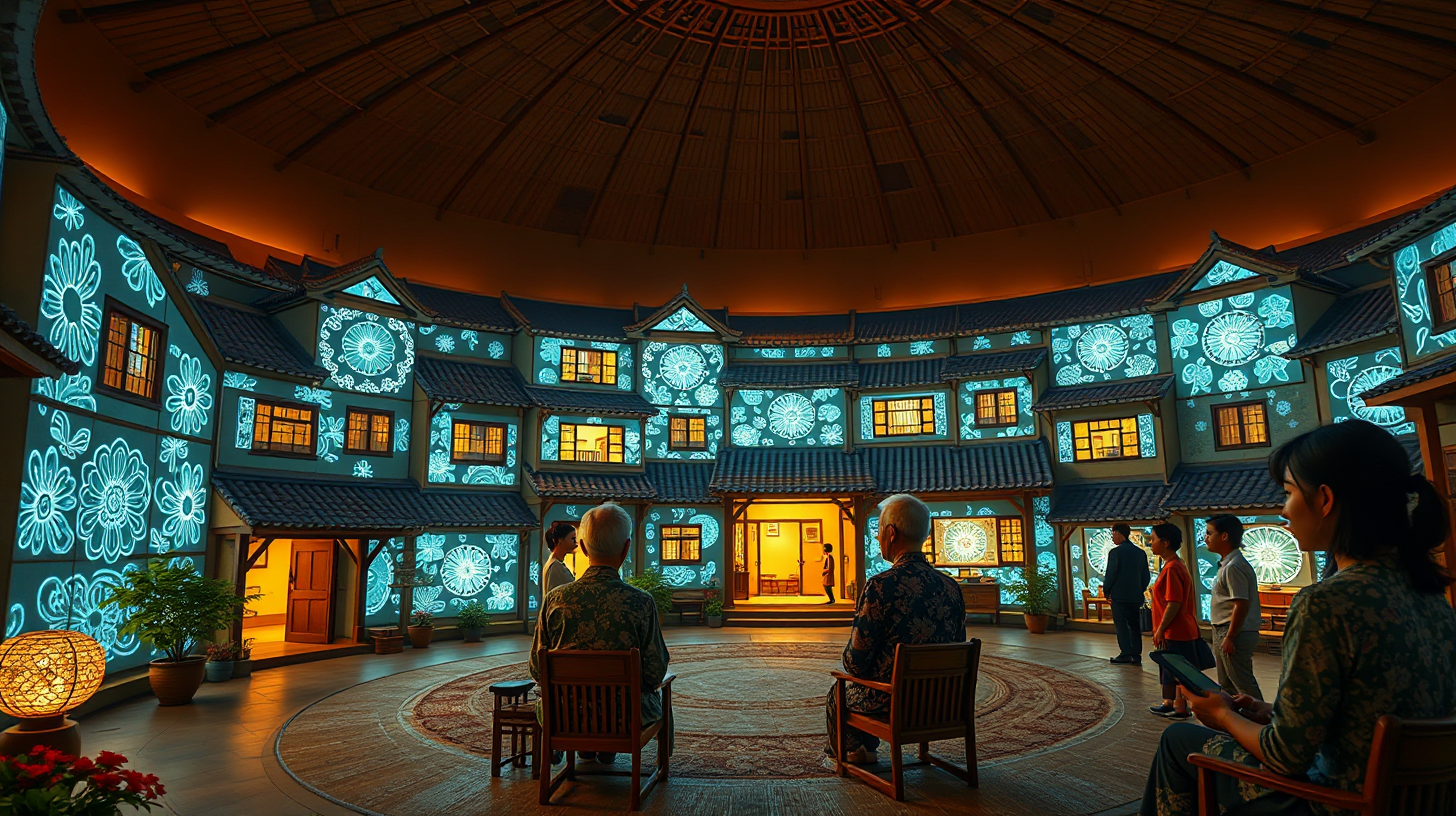 作图提示词:A circular community center designed like a traditional Hakka walled house, where elderly residents wear neural embroidery devices that transform folk songs and embroidery patterns into dynamic light patterns. Young people project these patterns onto their home facades using cultural gene chains. The interior is warm and inviting, with the glowing patterns creating a mesmerizing display that blends tradition with cutting-edge technology. Photographic style: Close-up shots alternating with wide angles to capture both the intimate cultural moments and the expansive light displays. Warm interior lighting contrasts with the cool tones of the projected patterns. Soft focus on the elderly residents to emphasize their connection to tradition, while the light patterns remain sharp and vibrant. Slow shutter speed to capture the motion of the dynamic light displays.