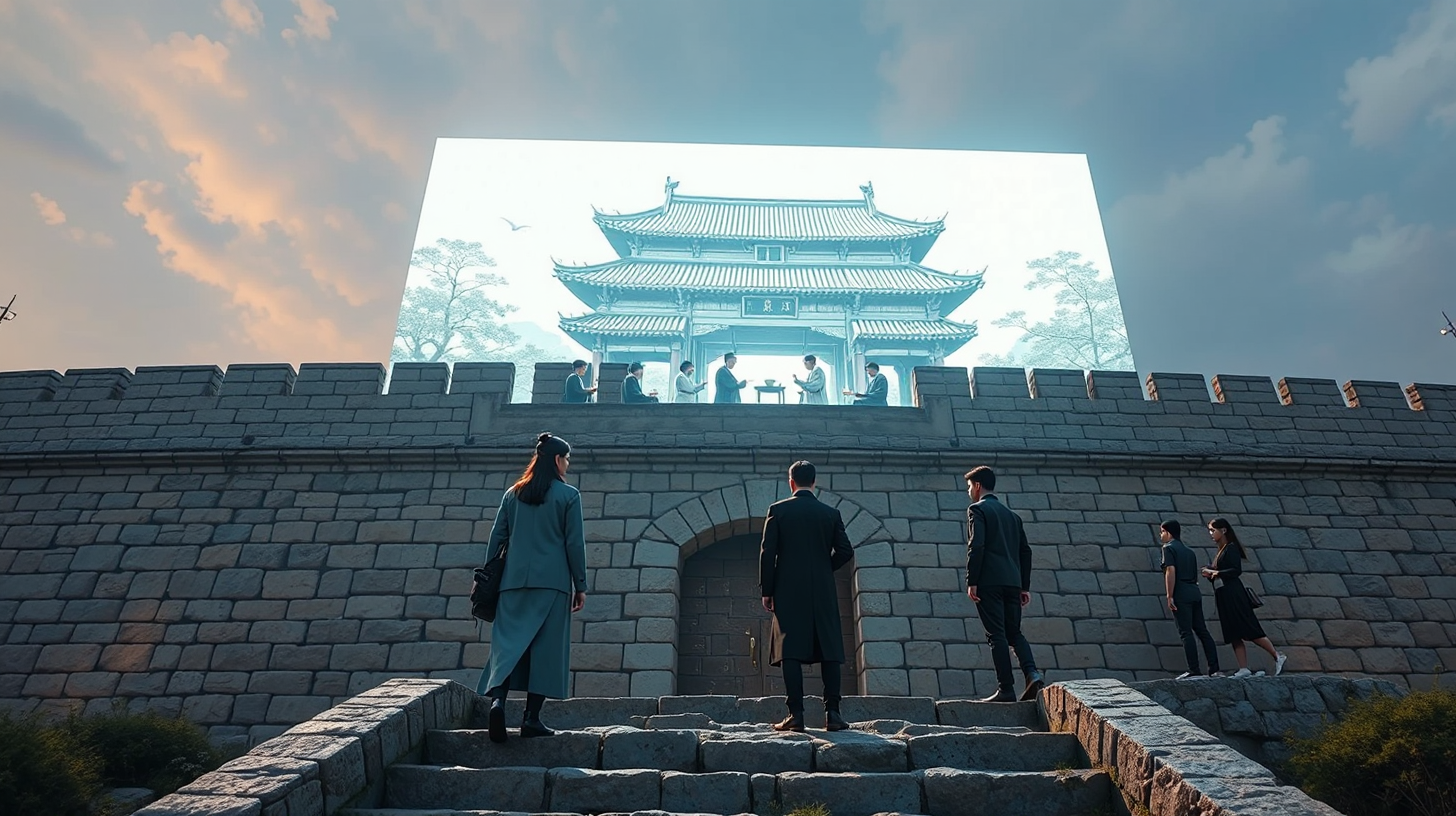 作图提示词:An ancient city wall with a massive holographic projection above it, recreating the Song Dynasty version of Ganzhou. Modern citizens and historical figures interact in the light projection, participating in a traditional tea ceremony. The scene blends past and future, with the intricate details of the historical recreation contrasting with the sleek modern attire of the observers. The lighting is dramatic, with the hologram casting an ethereal glow over the ancient stones. Photographic style: Low-angle shot to emphasize the grandeur of the ancient wall and hologram. Mixed lighting with cool tones for the modern elements and warm tones for the historical projection, creating a striking contrast. High detail in both the stone textures and holographic effects, with a slight motion blur to suggest the hologram’s dynamic nature.