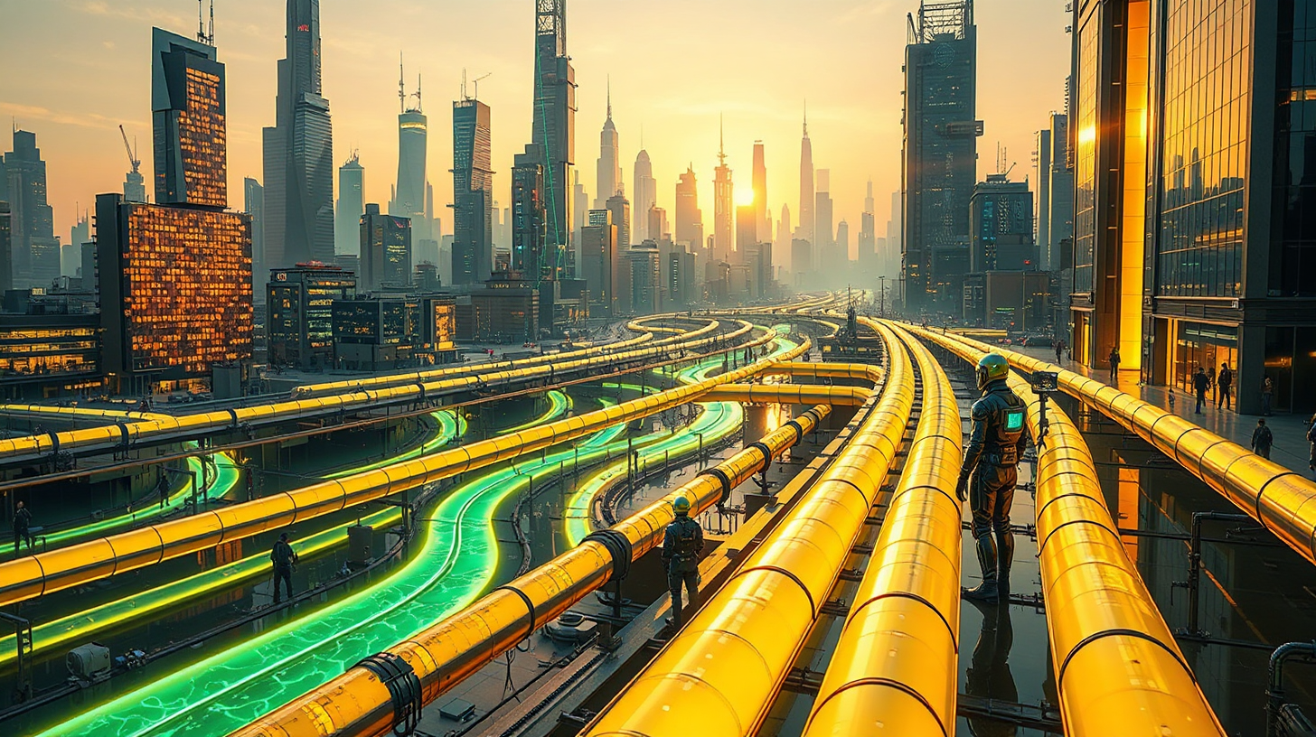 作图提示词:A futuristic cityscape at dawn, with glowing rivers of rare earth elements flowing through transparent pipelines, creating a network of luminous energy channels. Engineers in high-tech suits adjust harmonic frequency devices, synchronizing the light waves of different rare earth elements. The scene is bathed in the soft golden light of sunrise, with the glowing rivers casting reflections on the sleek, modern buildings. The composition emphasizes the vastness of the city and the intricate details of the energy system, creating a sense of awe and technological wonder. Photographic style: Wide-angle shot with deep depth of field to capture the expansive cityscape and intricate pipeline details. Soft golden sunrise lighting enhances the futuristic glow, with reflections adding depth. High dynamic range (HDR) to balance the bright glowing rivers and darker urban structures.