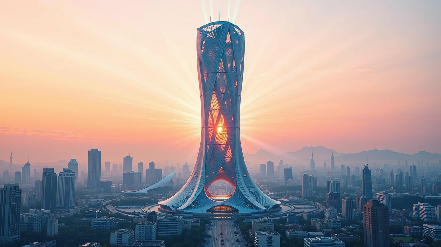 描述:晨曦微露时,石家庄的量子纺织塔如巨人般矗立,表面的光敏纳米材料像被赋予生命的织梭,将第一缕朝霞捕捉、编织成流动的七彩锦缎。塔基反射水池中,晨光与纳米材料的光影交织,形成梦幻般的倒影,整座建筑仿佛在为城市缝制一件缀满晨曦星辉的霓裳,静谧中透着科技与自然交融的震撼美感。