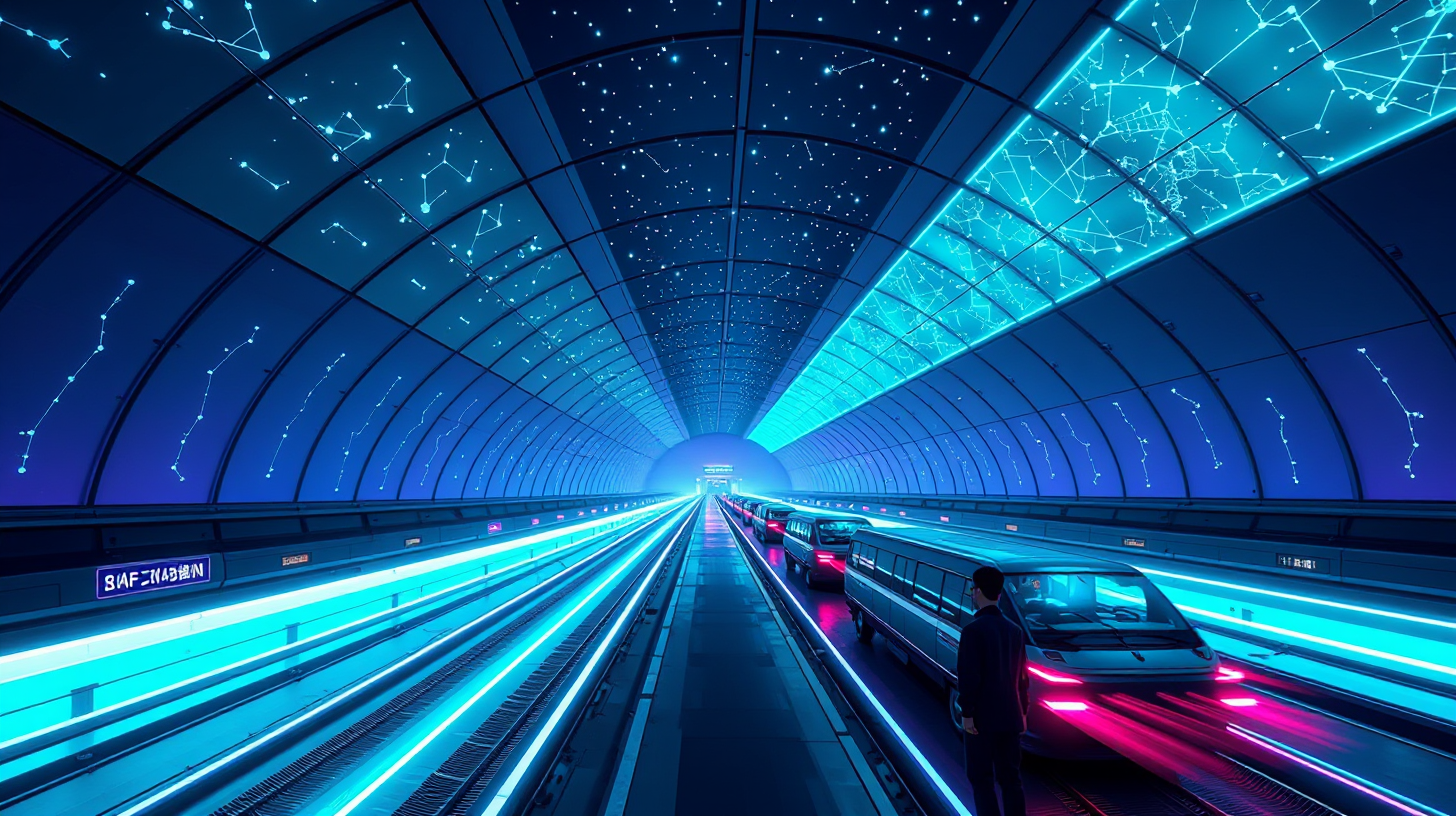 描述:子夜的交通枢纽站中,穹顶的星座投影与地面量子轨道交织成璀璨的立体导航,可变形补给舱如贴心侍者般无声变换形态,为夜归人提供定制服务。蓝紫色的生物霓虹灯光柔和地包裹着空间,冰冷的科技装置在星座光影下透出人性温度,让深夜的归途不再孤单,仿佛整个银河都在为晚归的行者点亮回家的路。