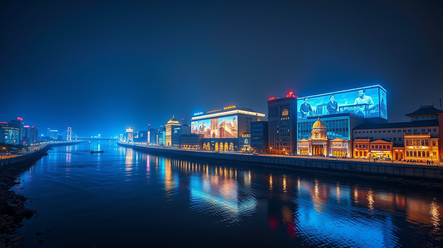 描述:夜幕降临时,滹沱河床的神经光带如蓝色脉络次第点亮,两岸建筑投射出石家庄工业历史的全息影像。钢铁厂房的剪影与生态智能城市的轮廓在河面上重叠,冷调的光带与暖调的历史影像形成奇妙对比,河水荡漾间,仿佛整座城市沉入时空交错的冥想,让工业记忆与绿色未来在夜色中完成一场温柔的对话。