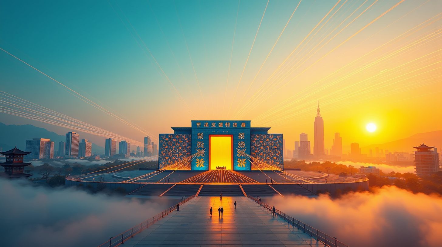 作图提示词:A hyperrealistic dawn panorama of 2095 Shijiazhuang, where fractal light conduits pulse with quantum-entangled photons between the Xibaipo Memorial’s augmented reality facade and the city’s photonic infrastructure. Captured with tilt-shift lens at golden hour (5:32am local time), featuring time-lapse streaks of amber sunlight refracting through prismatic energy fields. Color grading transitions from Pantone 19-4052 TCX (Classic Blue) to 16-1359 TCX (Vibrant Yellow) with interference pattern overlays. Composition follows the golden spiral from memorial to skyline, depth enhanced by atmospheric perspective from overnight mist.
