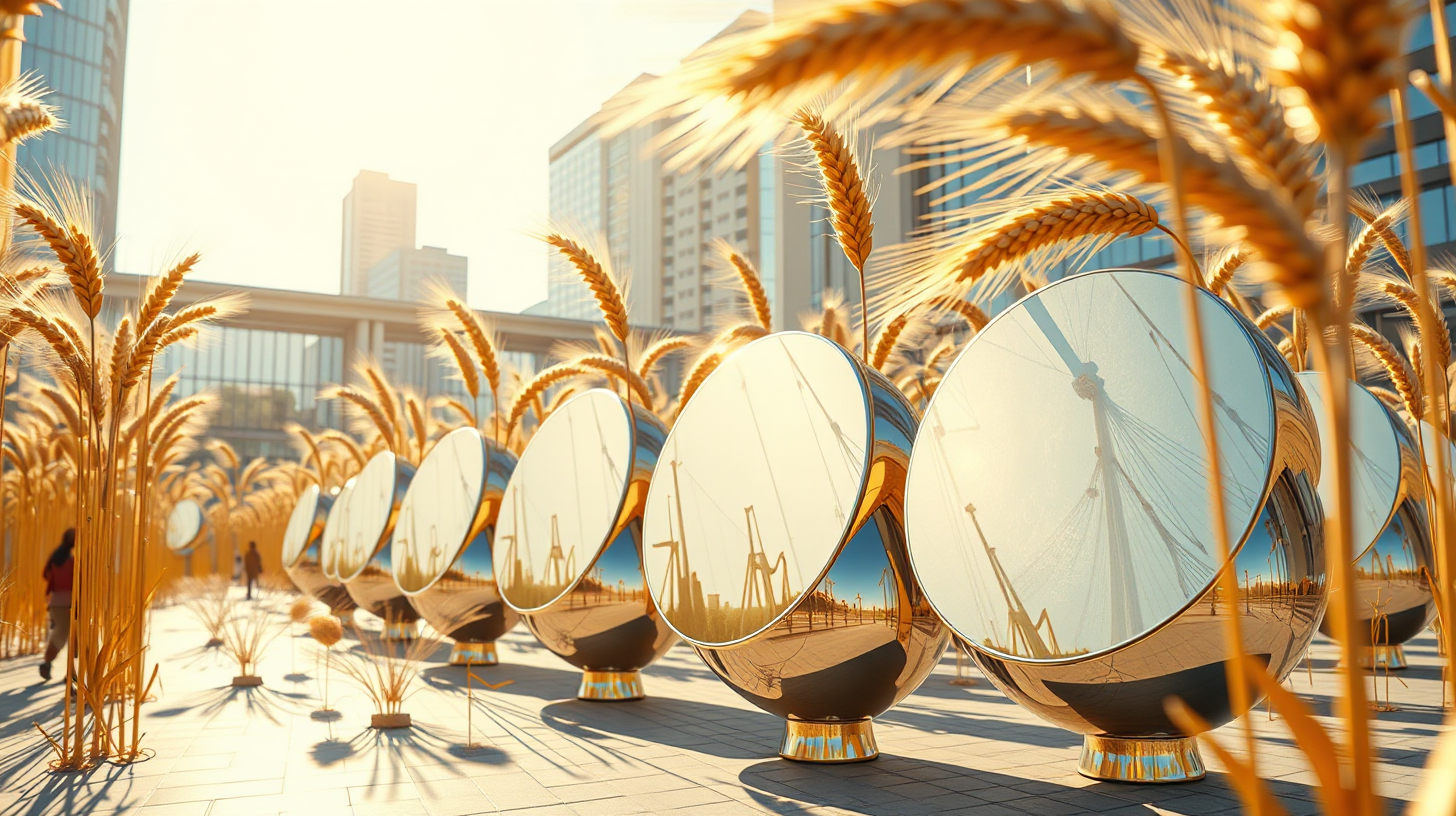 作图提示词:A sunlit urban plaza filled with magnetically suspended wheat sculptures, their polished surfaces converting solar energy into three-dimensional holograms demonstrating ancient Zhaozhou Bridge engineering principles. Captured at high noon with crisp shadows using a medium telephoto lens (85mm) to compress perspective, featuring golden hour lighting that accentuates the metallic textures, with motion blur applied to the gently oscillating wheat stalks to convey kinetic energy.