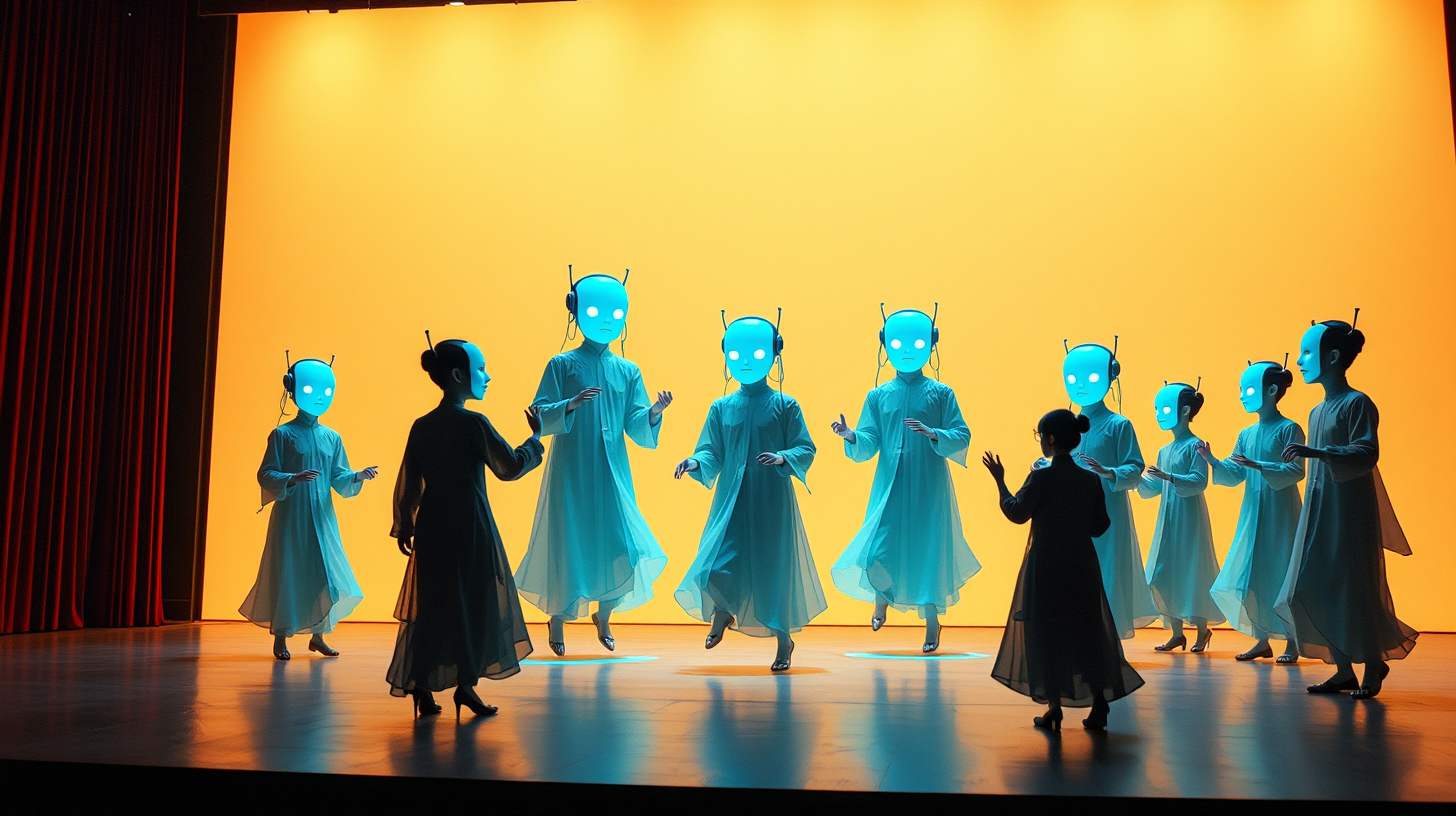 作图提示词:An avant-garde performance space featuring levitating AI actors whose quantum-linked holographic masks dynamically synchronize with traditional Bangzi opera movements. Illuminated by a chiaroscuro lighting scheme that contrasts warm tungsten stage lights with cool cyan holograms, captured from an elevated vantage point using a tilt-shift lens to maintain focus throughout the three-dimensional performance area, with precise attention to the refraction details in the holographic projections.