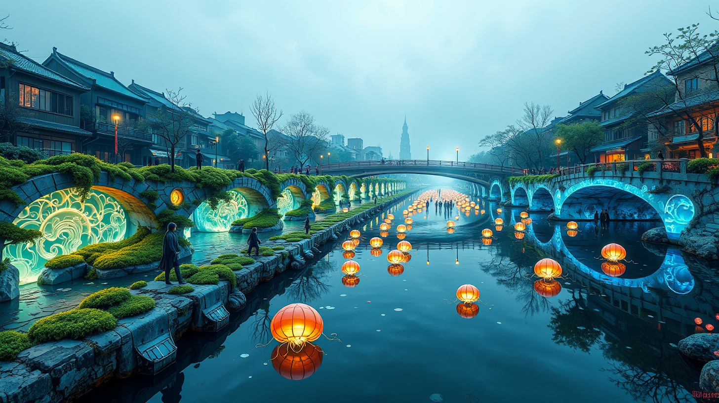 作图提示词:A serene wide-angle composition of Suzhou Creek transformed into a bioluminescent light-flow river with embedded ecological simulators. Quantum-enhanced moss grows on bridge piers forming glowing fractal reliefs, while citizens’ bioelectric dance movements power floating jellyfish lanterns. Rendered in eco-futurism style with bioluminescent lighting and soft glow diffusion effects. Composition uses symmetrical reflection with the river as central axis, featuring harmonious blend of organic curves and technological elements. Shot with cool white-balanced lighting contrasting warm human elements, using slow shutter speed to capture motion blur of dancers.