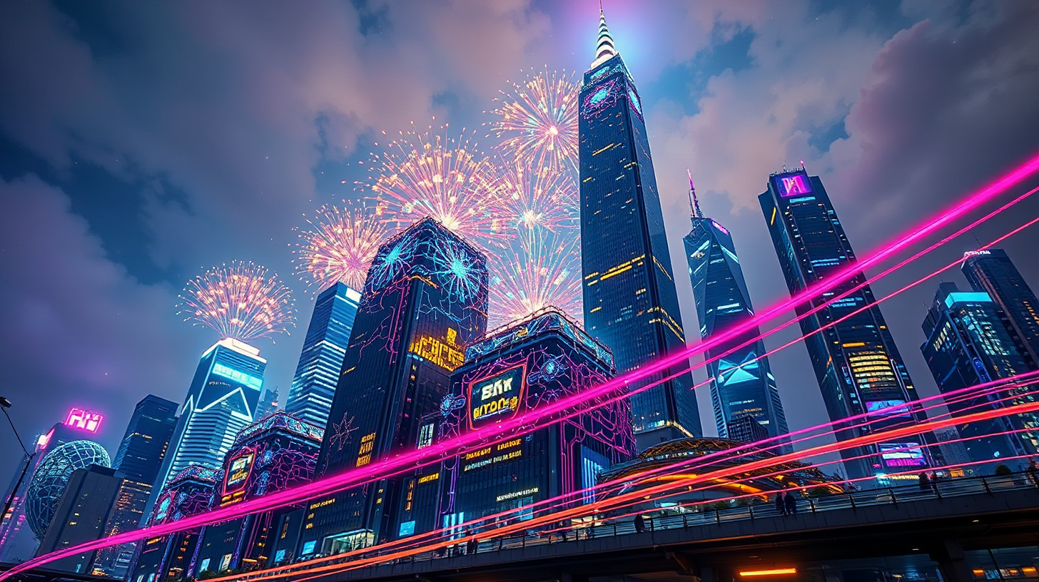 作图提示词:A dramatic low-angle night shot of Lujiazui’s skyline featuring pulsating neural-network-shaped quantum server clusters emerging from skyscrapers, with luminous data streams resembling organic fireworks. Young innovators project holographic concepts via brainwave interfaces while quantum 3D printers materialize designs in real-time. Rendered in ultra-HD with cyberpunk aesthetic, featuring neon-illuminated surfaces and atmospheric volumetric lighting. Composition uses Dutch angle for dynamic tension, with vibrant data trails creating leading lines. Color palette combines electric blues and magentas with gold accents, shot with long exposure for light trails.