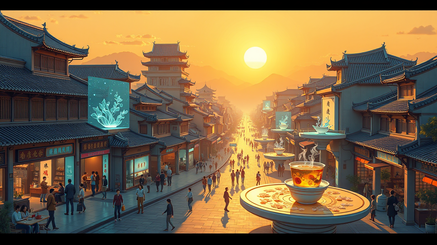 作图提示词:Futuristic Zhongshan Road in Xiamen, China, featuring traditional Minnan-style arcade buildings with anti-gravity extensions, citizens interacting with floating tea platforms, robotic tea artisans creating digital tea art in the air using advanced projection systems, augmented reality tea cups capturing cultural narratives, bathed in warm golden sunrise light that highlights the fusion of heritage architecture with holographic interfaces, aerial perspective emphasizing the harmonious blend of tradition and innovation, rendered with cinematic lighting and vibrant color grading.