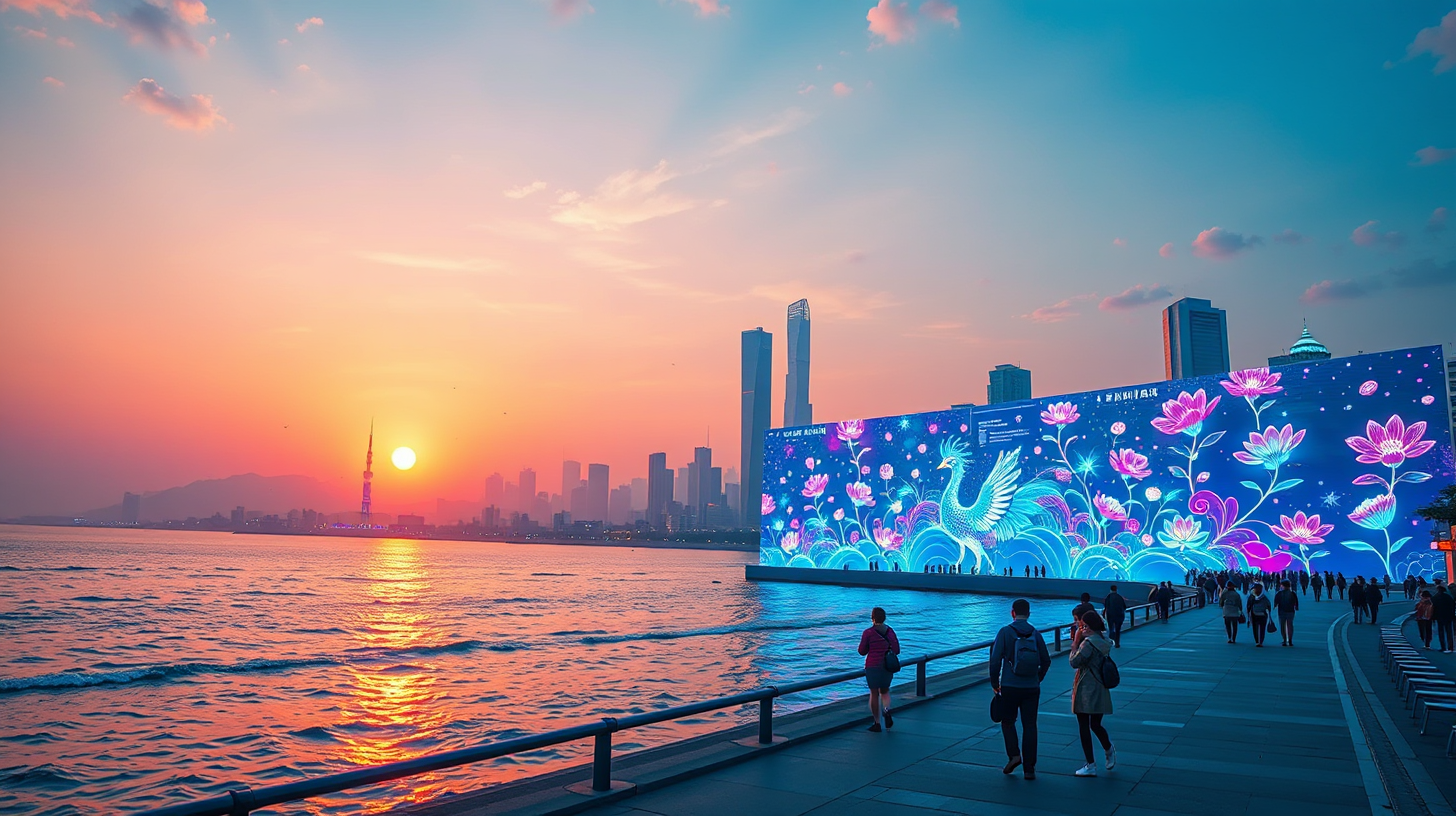 作图提示词:Dramatic sunset at Xiamen’s Huandao Road coastline, featuring an interactive ‘Emotion Spectrum Wall’ that responds to pedestrians’ neural activity by generating dynamic holographic displays, including phoenix flower-shaped light projections and floating luminous particles forming invitation messages, with the warm orange-pink twilight reflecting on the ocean surface, captured in an ultra-wide composition that contrasts the natural sunset hues with vibrant neon elements, creating a cinematic atmosphere of technological celebration, using shallow depth-of-field to emphasize foreground interactions against the expansive cityscape.