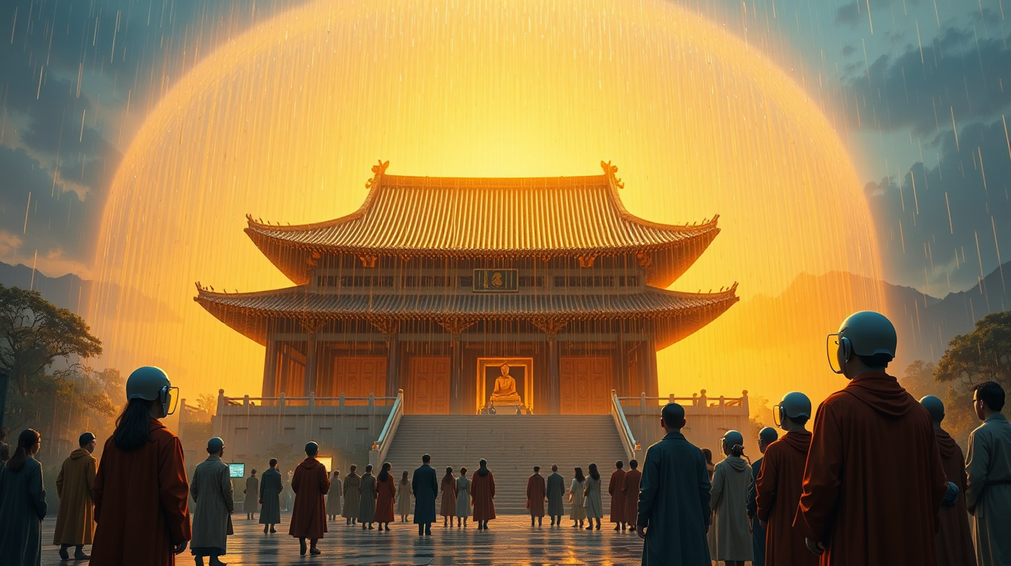 描述:暮色中的南普陀寺,纳米佛钟自鸣的刹那,金色声波在雨幕中筑起光穹。暴雨撞击防护罩化作万千琉璃佛珠般的发光水雾,悬浮半空折射出虹彩。僧侣造型的智能体拂动数据袈裟,指尖划过全息界面调试“慈悲算法”,将雨滴换算成祝福参数。闽南古建的飞檐斗拱在量子场中勾勒出新的曼荼罗,传统与科技在此编织出神秘的保护结界。