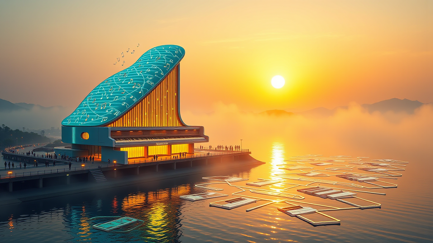 描述:晨曦为鼓浪屿钢琴码头镀上鎏金薄纱,钢琴造型的能源塔倾泻出液态光瀑般的量子音阶,建筑立面如彩虹棱镜随旋律变换光谱。琴键状光轨在晨雾中划出几何弧线,声波净化系统启动时,细密的光网如蛛网捕捉空气中的微尘,海水倒映着流动的光纹,整座岛屿在科技与自然的和弦中舒展苏醒。