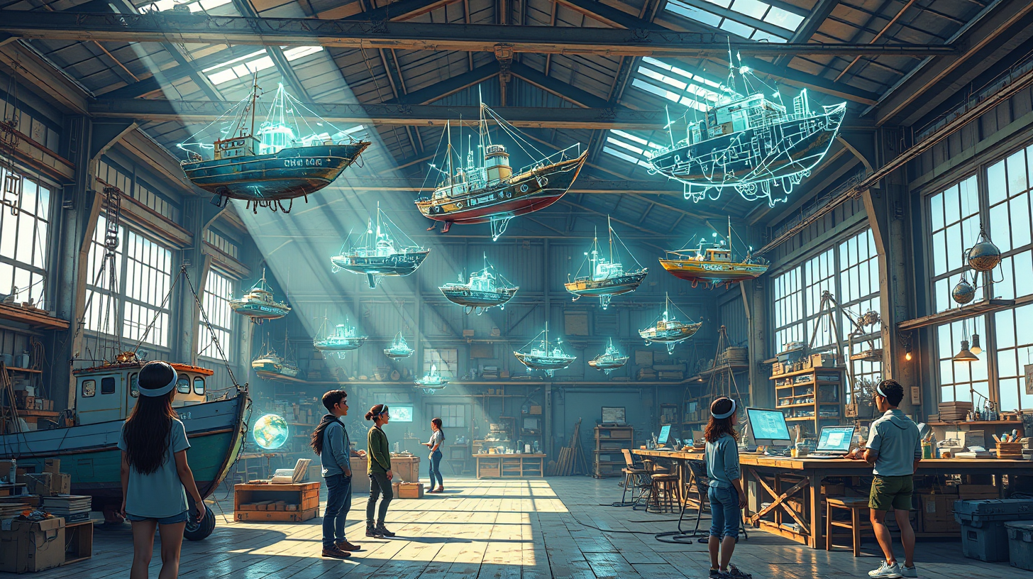 作图提示词:The repurposed fishing harbor now a ‘Magnetic Levitation Creative Workshop’, where young makers wearing neural interface headbands materialize glowing design schematics from their thoughts. Recycled fishing boat parts float mid-air as eco-sculptures, suspended by anti-gravity fields. Industrial-chic space with exposed steel beams contrasting with holographic projections, dynamic lighting from floating thought-forms, highly detailed steampunk-meets-cyberpunk aesthetic, volumetric light shafts through high windows. Use a wide-angle lens to capture the expansive workshop, deep depth of field to show all the floating elements, and mixed lighting to highlight the contrast between industrial and holographic elements.