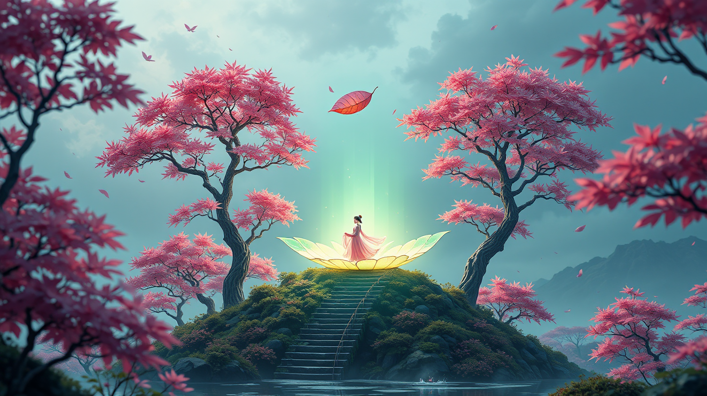 作图提示词:A towering morphogenetic hub with glowing maple trees at its summit, their leaves embedded with Kunqu opera genes, a single falling leaf suddenly projecting a miniature holographic stage mid-air showing Du Liniang’s graceful water sleeve dance, the scene illuminated in ethereal pink and green bioluminescence, ultra-futuristic Chinese aesthetic blending organic and technological elements, magical and poetic atmosphere. The setting reflects a futuristic Suzhou where biotechnology and traditional arts merge seamlessly.